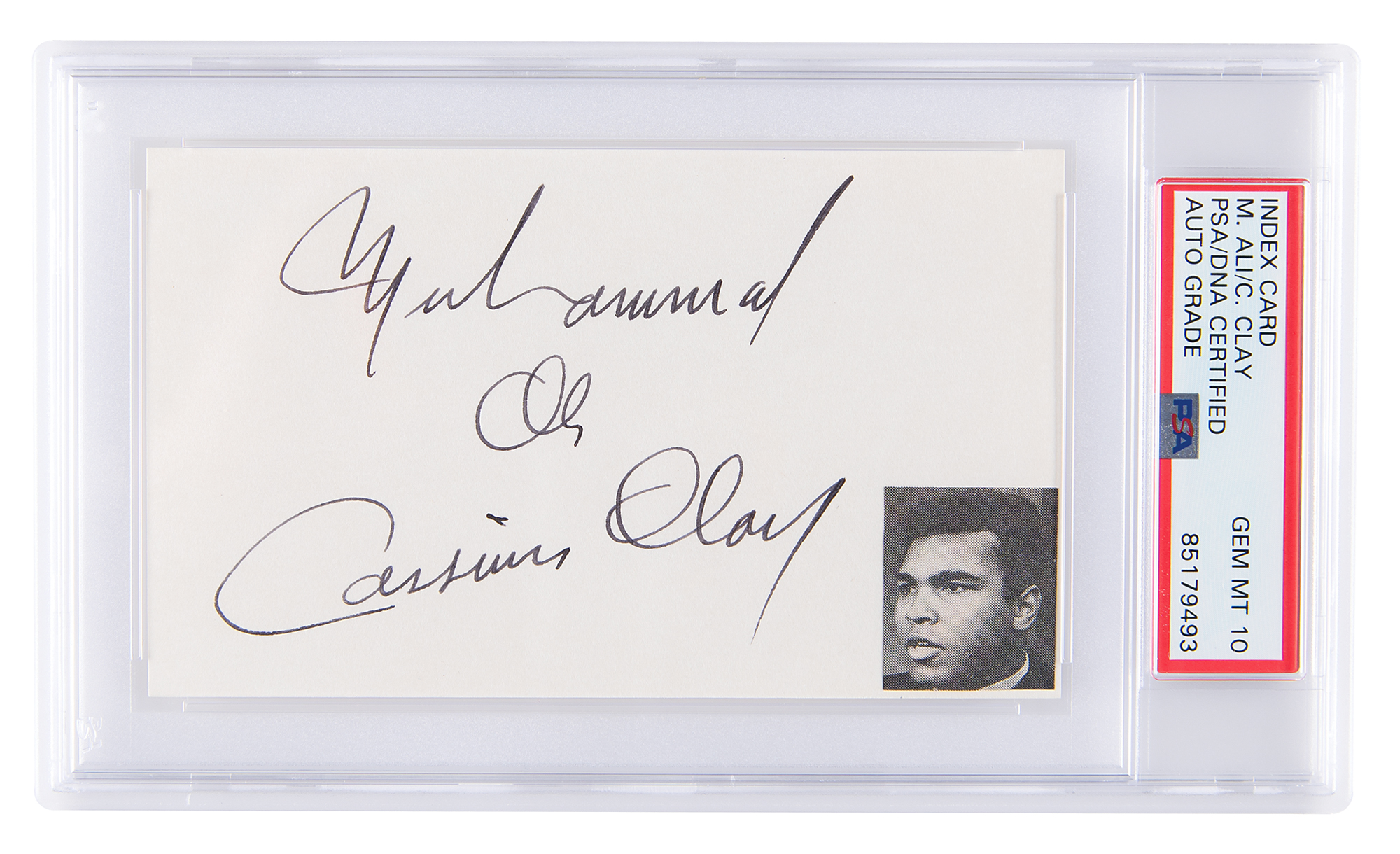 Ideal vintage fountain pen signature, "Muhammad Ali, Cassius Clay,” on a white 5 x 3 card, with a small portrait affixed at the lower right. In very fine condition. Encapsulated and graded by PSA/DNA as "GEM MT 10." A superior example of Ali signing with his 'free name' and his 'slave name.'