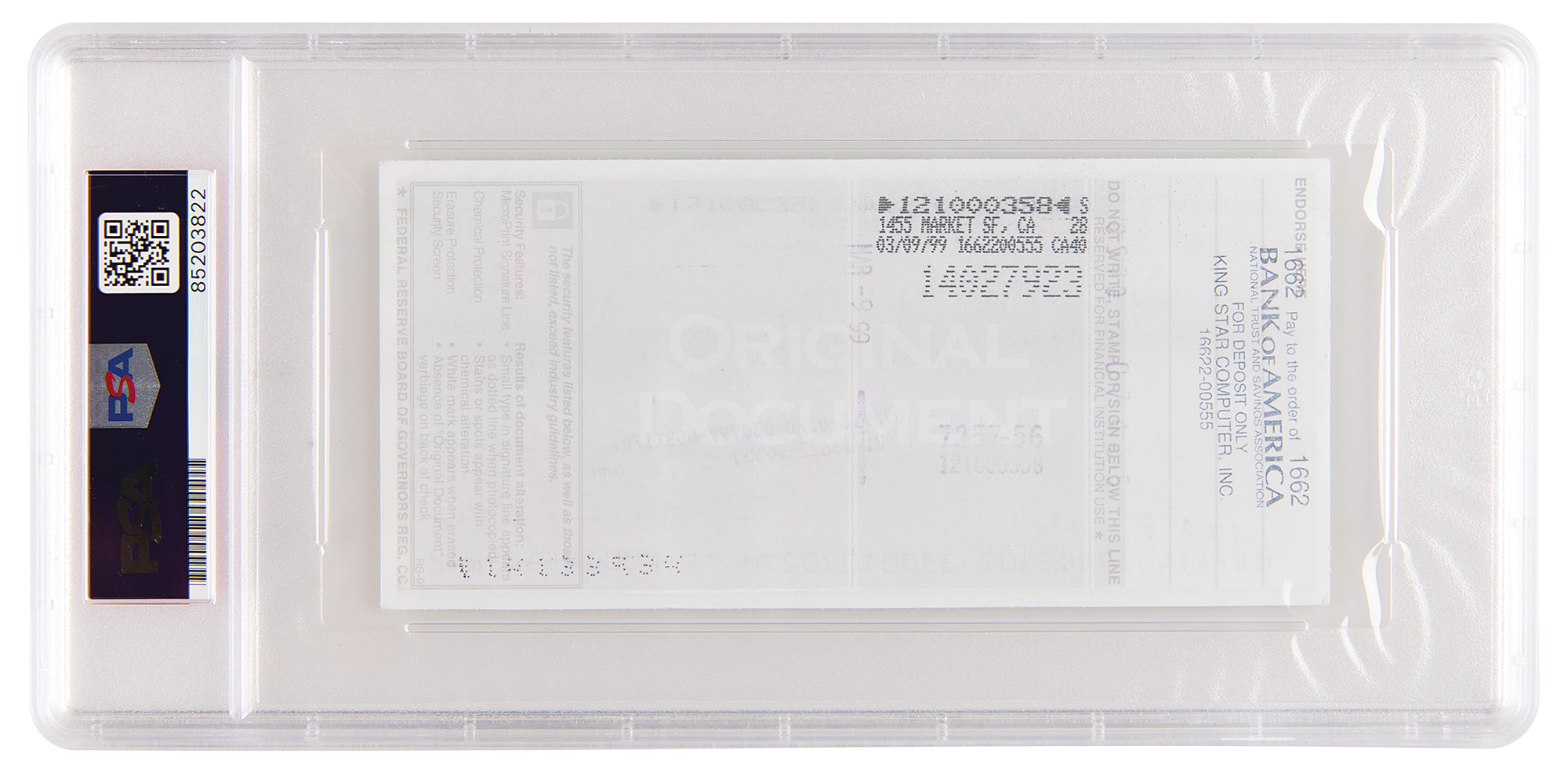 Google, Inc. business check, 6 x 2.75, filled out in another hand and signed by both co-founders, "Lawrence Page" and "Sergey Brin," payable to King Star Computers for $145,679.81, March 8, 1999. Google's address is given as "165 University Ave., Palo Alto, CA 94301," otherwise known as the 'Lucky Building' or 'Karma Building.' In fine condition. Encapsulated and graded by PSA/DNA as "MINT 9." Only one other Page–Brin dual signed check has been sold, and we know of no more.