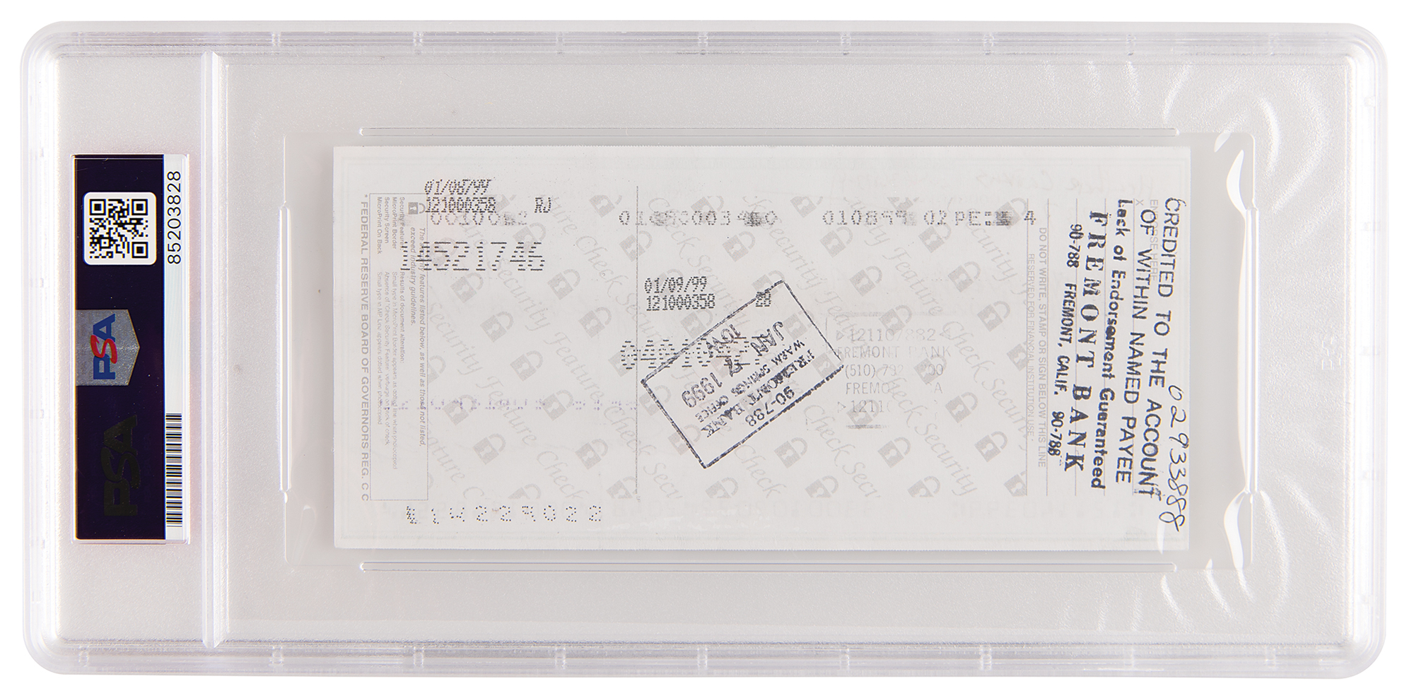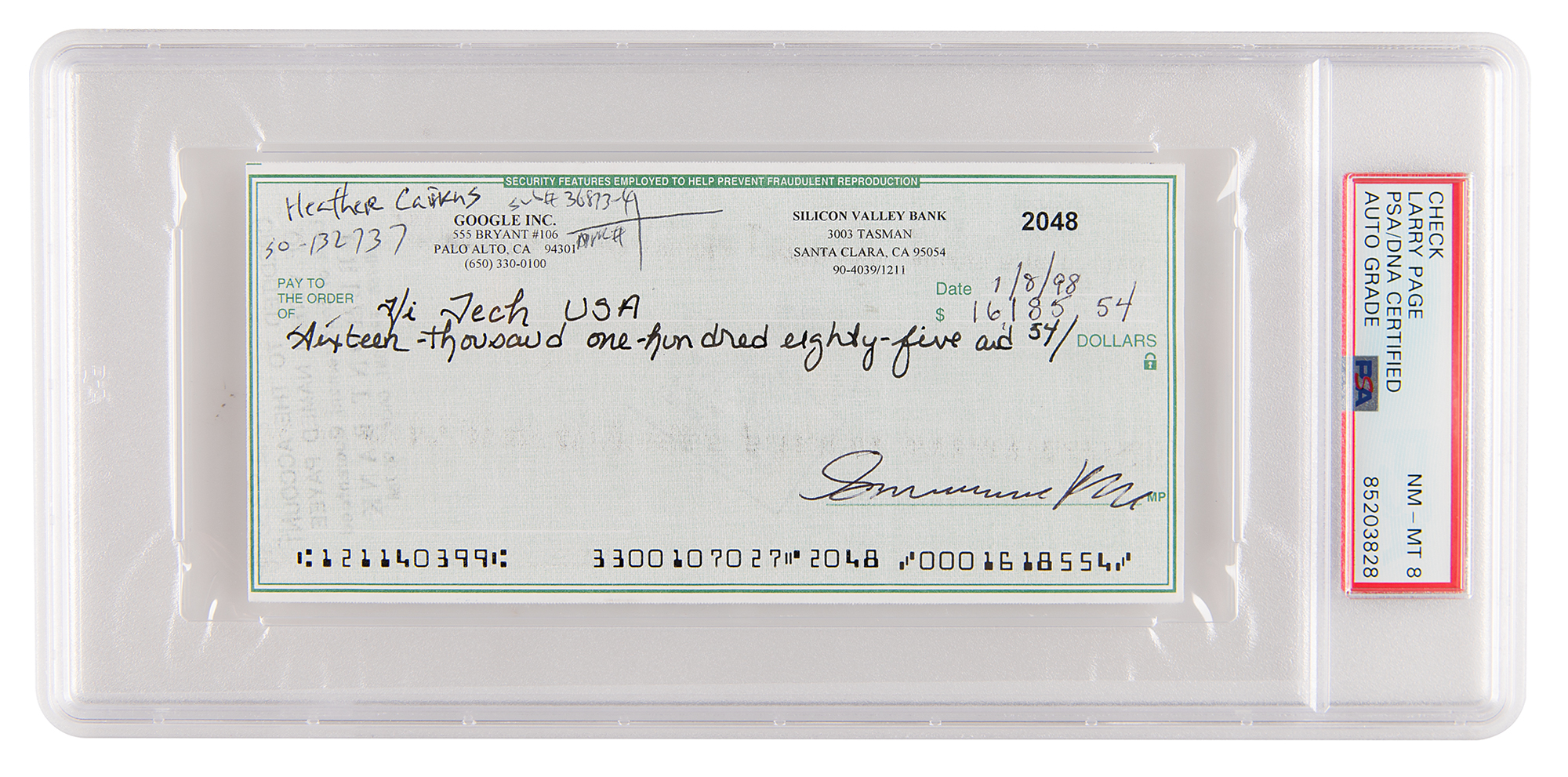 Google, Inc. business check, 6 x 2.75, filled out in another hand and signed by Page, "Lawrence Page," payable to Hi Tech USA for $16,185.54, January 8, 1999 [with "98" written erroneously in the first days of the new year]. Google's address is given as "555 Bryant #106, Palo Alto, CA 94301." In fine condition. Encapsulated and graded by PSA/DNA as "NM-MT 8."