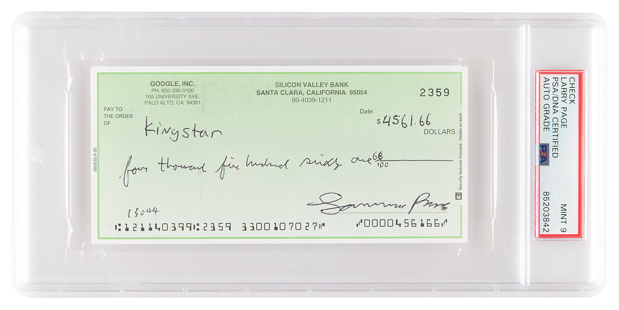 Google, Inc. business check, 6 x 2.75, filled out and signed by Larry Page, "Lawrence Page," payable to "Kingstar" for $4561.66, no date but processed by the bank on April 16, 1999. Google's address is given as "165 University Ave., Palo Alto, CA 94301," otherwise known as the 'Lucky Building' or 'Karma Building.' In fine condition. Encapsulated and graded by PSA/DNA as "MINT 9."