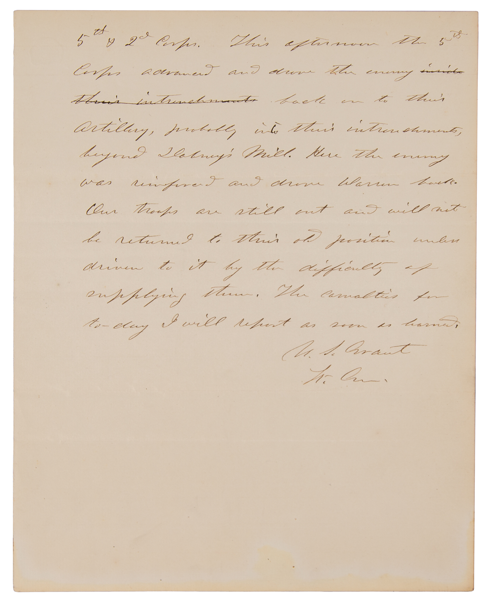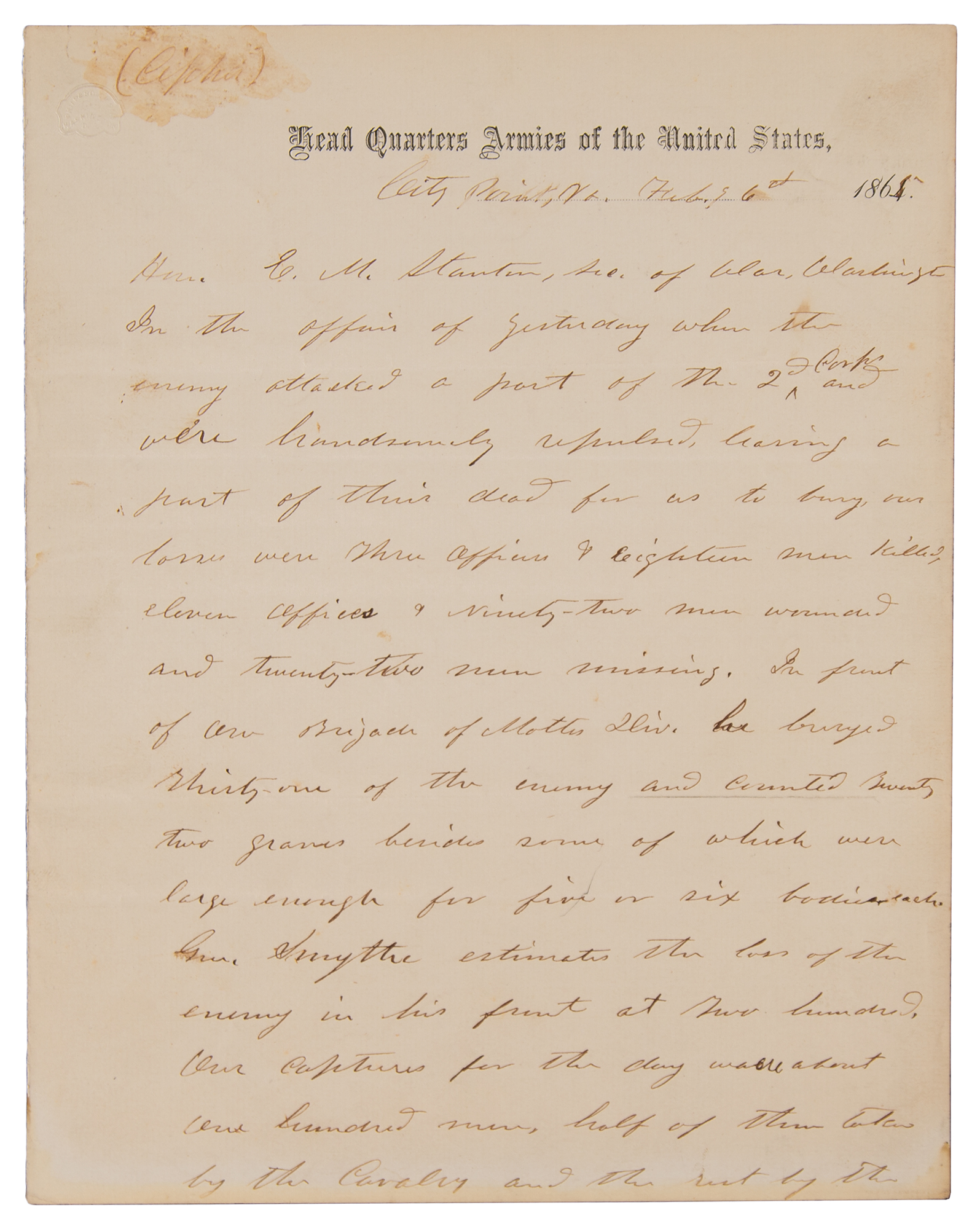 Grant’s casualty report relates to the Battle of Hatcher's Run, fought on February 5–7, 1865, as part of a series of Union offensives during the siege of Petersburg, which aimed at cutting off Confederate supply traffic on Boydton Plank Road and the Weldon Railroad west of Petersburg, Virginia. The Union plan was to send Brig. Gen. David McM. Gregg's cavalry out to the Boydton Plank Road to destroy all the Confederate supply wagons they could find, while the V Corps and II Corps provided support and kept the Confederates occupied to the north and east. The result was a victory for the Union, whose forces nearly tripled that of their enemy (34,517 to 13,835). A detailed letter of loss from late in the Civil War — Lee's surrender came just two months after General Grant penned this letter.