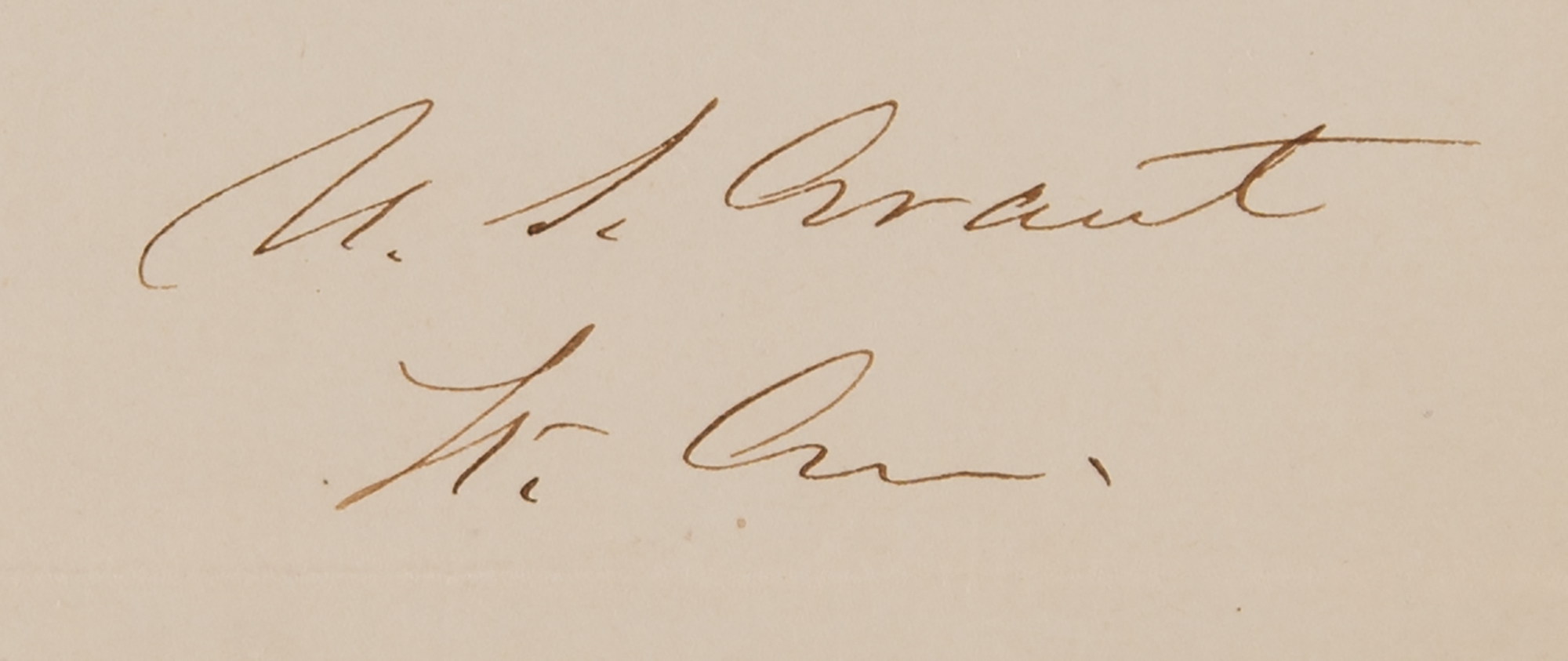 Civil War-dated ALS signed “U. S. Grant, Lt. Gen.,” two pages, 7.75 x 10, Head Quarters Armies of the United States letterhead, February 6, 1865. Addressed from City Point, Virginia, a handwritten letter to Secretary of War Edwin M. Stanton, in full: “In the affair of yesterday when the enemy attacked a port of the 2d Corps and were handsomely repulsed, leaving a part of their dead for us to bury, our losses were three officers & eighteen men killed, eleven Officers & ninety-two men wounded and twenty-two men missing. In front of one Brigade of Mott’s Div. he buried thirty-one of the enemy and counted twenty two graves besides some of which were large enough for five or six bodies each. Gen. Smythe estimates the loss of the enemy in his front at two hundred. Our captures for the day were about one hundred men, half of them taken by the Cavalry and the rest by the 5th & 2d Corps. This afternoon the 5th Corps advanced and drove the enemy [Grant strikes through “inside this intrenchment”] back on to this Artillery, probably into this intrenchments, beyond Dabney’s Mill. Here the enemy was reinforced and drove Warren back. Our troops are still out and will not be returned to their old position unless driven to it by the difficulty of supplying them. The casualties for to-day I will report as soon as learned.” In fine condition, with a small stain to the top edge of the first page.