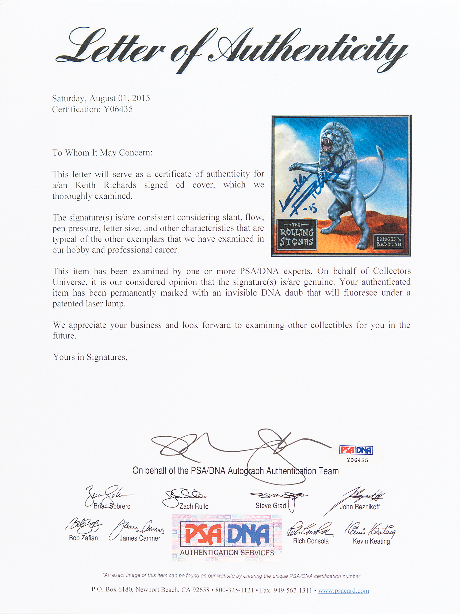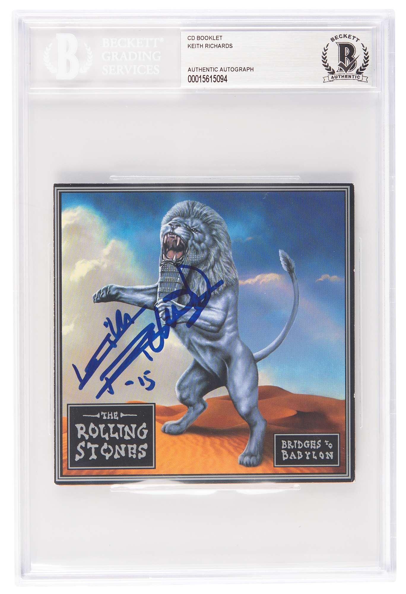 Bridges to Babylon CD booklet, nicely signed on the front in blue felt tip, "Keith Richards, '15." In very fine condition. Encapsulated in a Beckett authentication holder, and accompanied by a full letter of authenticity from PSA/DNA.