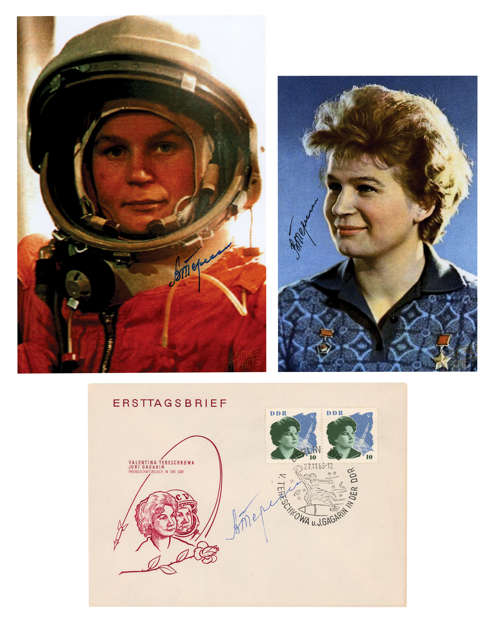 Three items signed by cosmonaut Valentina Tereshkova, the first woman in space: a color glossy 5 x 7 photo of Tereshkova dressed in a space suit, signed in blue felt tip; a color glossy 4 x 6 portrait, signed in black felt tip; and a commemorative cover honoring her pioneering flight, signed in blue ballpoint. In overall fine condition.