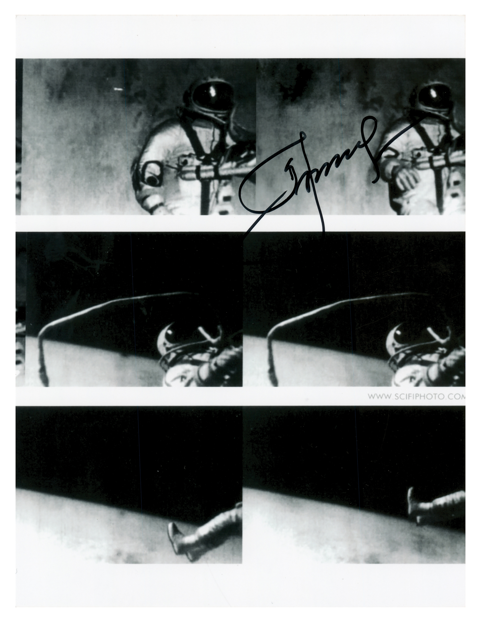 Glossy 6 x 8 ‘contact sheet-style’ photo containing six images of Alexei Leonov during his historic first spacewalk, signed in black felt tip by the heroic cosmonaut. In fine condition.