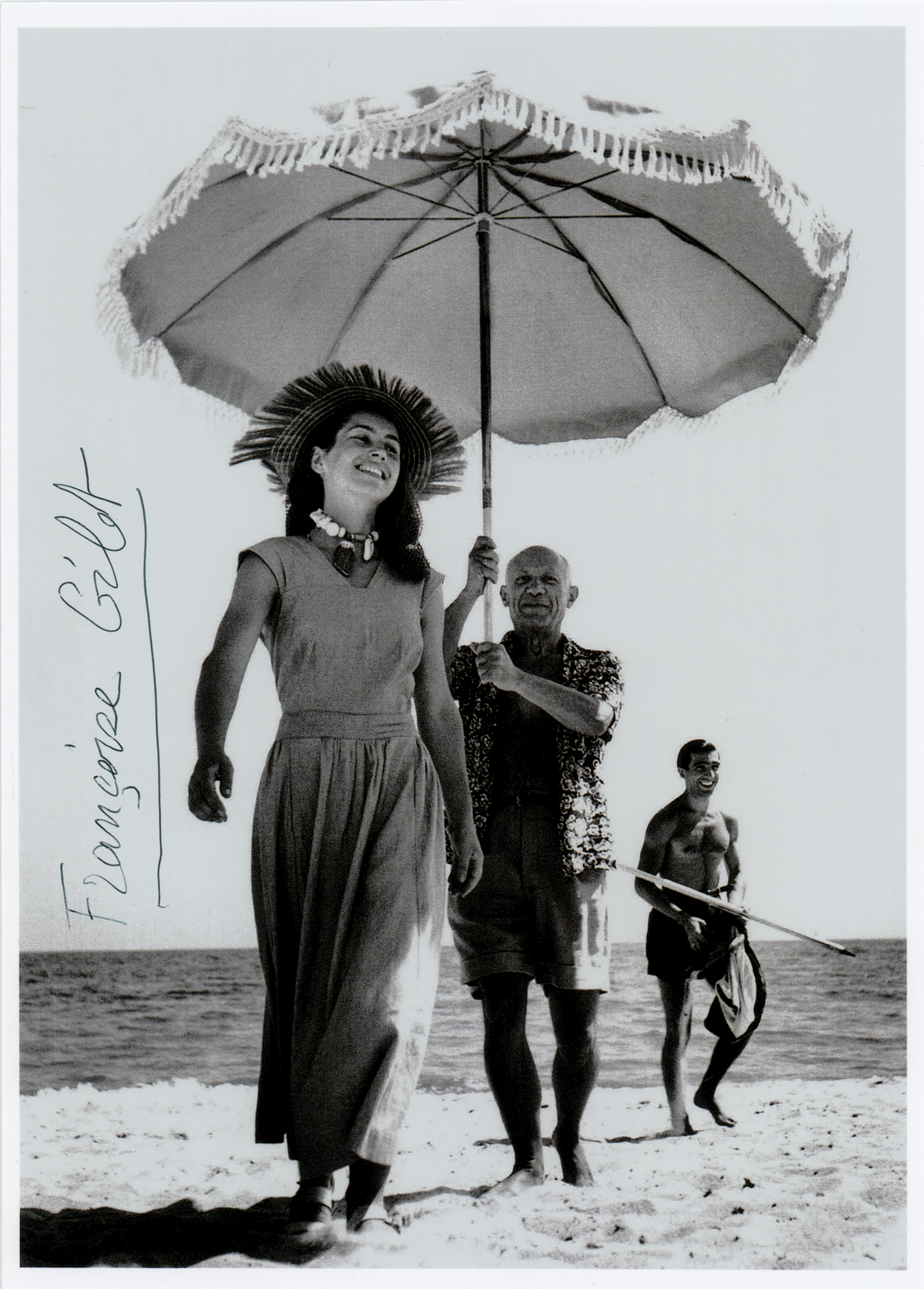 Glossy 7 x 9.75 photo of Gilot on the beach with Pablo Picasso—one of the most iconic images of the 20th century—signed vertically in black ballpoint, "Francoise Gilot." In fine condition.
