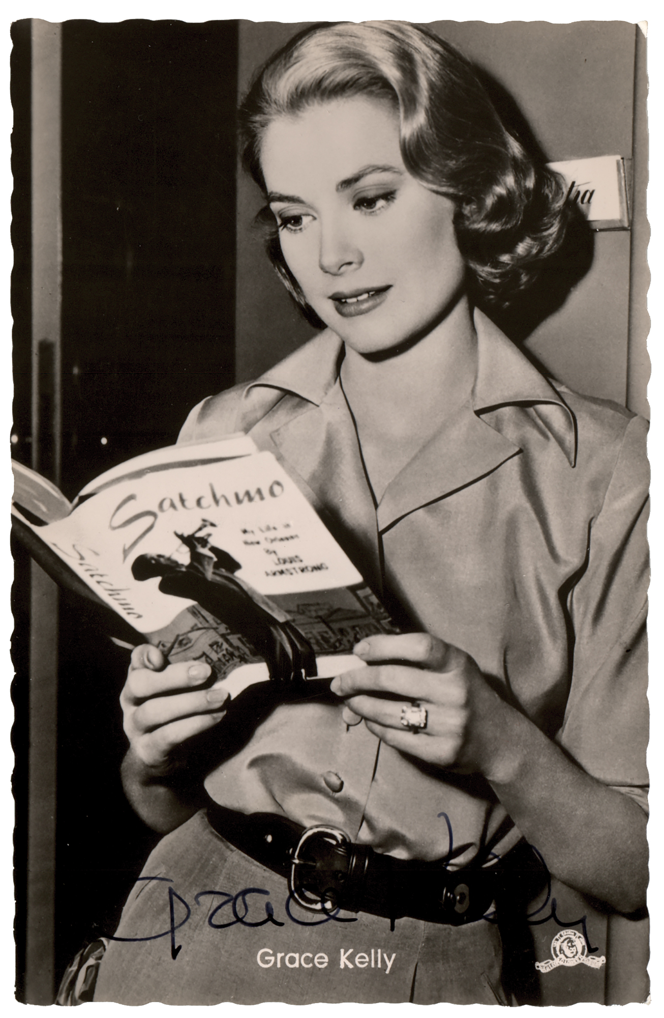 Vintage glossy 3.5 x 5.5 deckle-edge postcard photo of Grace Kelly reading Louis Armstrong’s autobiography Satchmo during production of the 1956 film High Society, signed neatly in black ink by the actress. In fine condition.