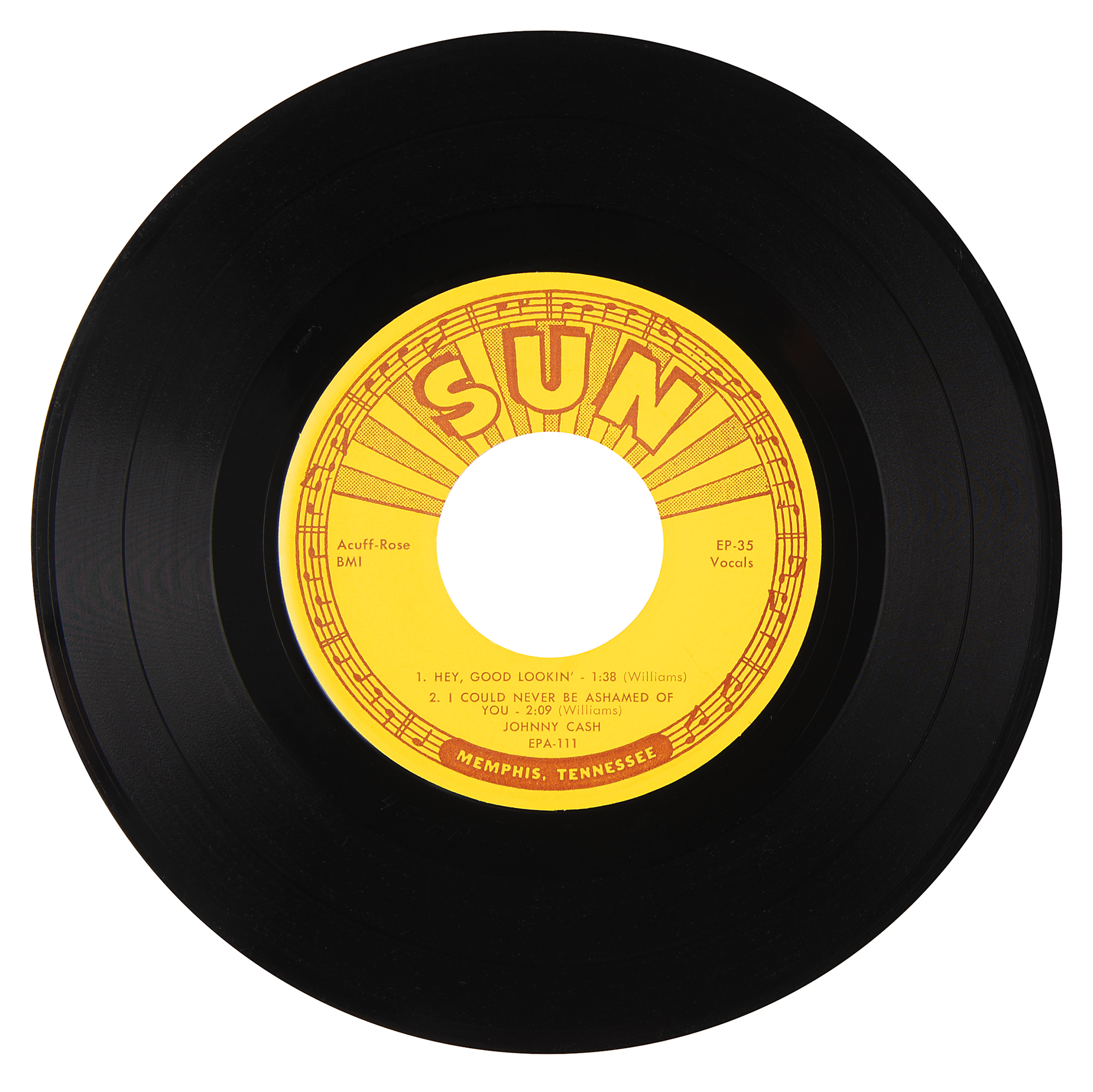 Sun Records (EPA-111) 45 RPM record for the Johnny Cash EP ‘Johnny Cash Sings Hank Williams,’ signed on the back cover in black ballpoint by Cash. The EP contains four songs: ‘I Can't Help It,’ ‘You Win Again,’ ‘Hey Good Lookin',’ and ‘I Could Never Be Ashamed of You.’ This special collection of Hank Williams songs sung by Johnny Cash was released by Sun Records in 1958. In fine condition, with a brush to the first name; the original, beautiful picture sleeve is well preserved and in excellent condition with bright graphics. The included record is in VG condition.
