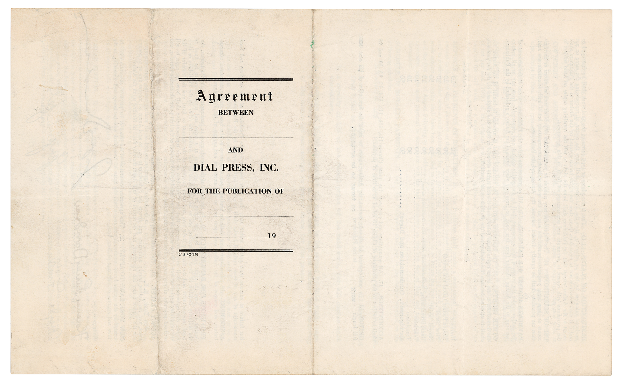 American sculptor (1883–1952) celebrated for his realistic portrait busts, among them Henry D. Thoreau, Albert Einstein, Dwight D. Eisenhower, Mohandas Gandhi, James Joyce, Helen Keller, Walt Whitman, and dozens more. Partly-printed DS, three pages on two adjoining sheets, 8.5 x 14, June 10, 1949. Agreement between Jo Davidson and the Dial Press for the publication of "an autobiography of not less than 150,000 words which shall include pictorial material, photographs and drawings, of his lifetime work." Signed at the conclusion in fountain pen by Jo Davidson, George W. Joel of the Dial Press, and two witnesses. In fine condition.