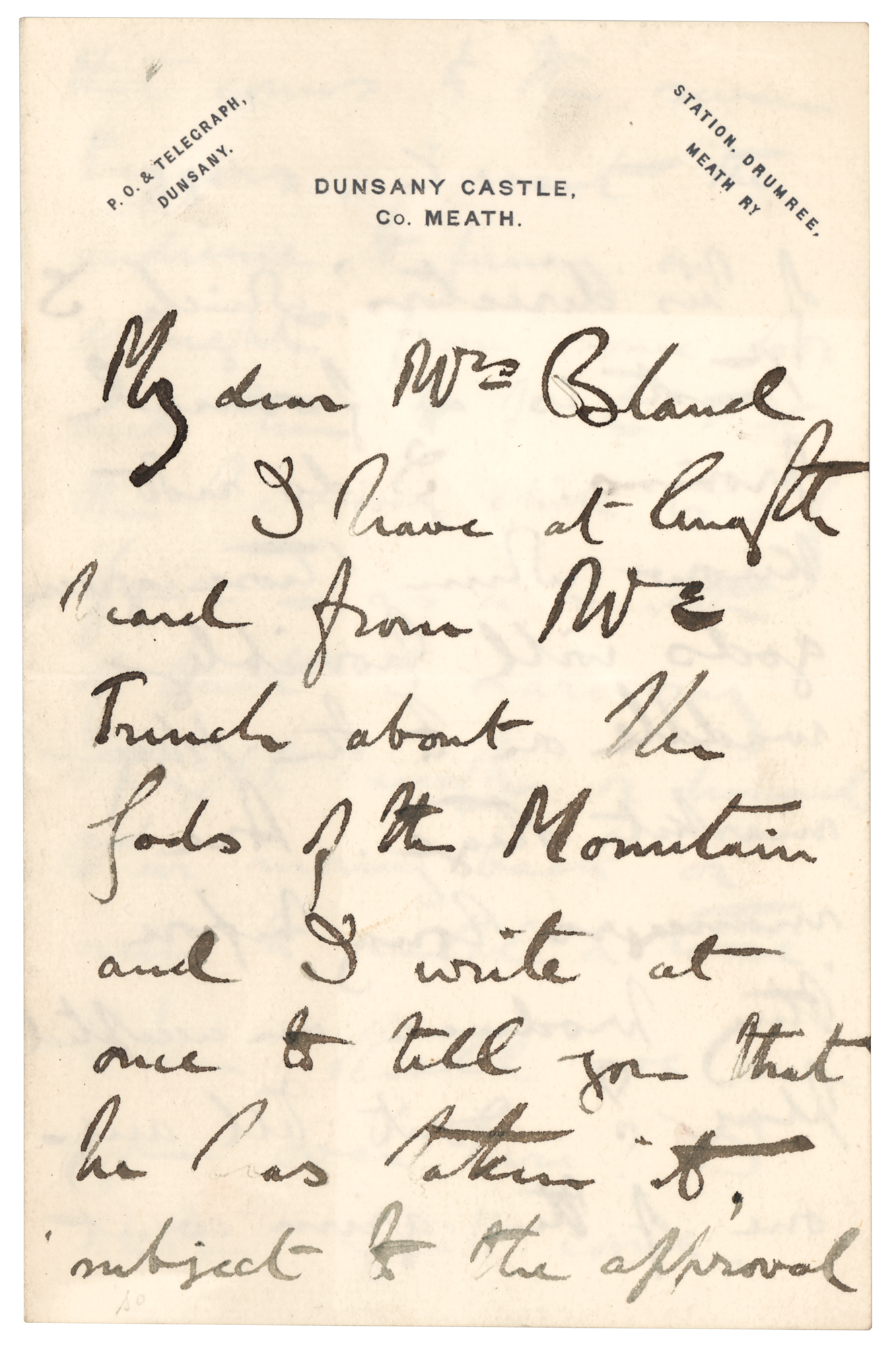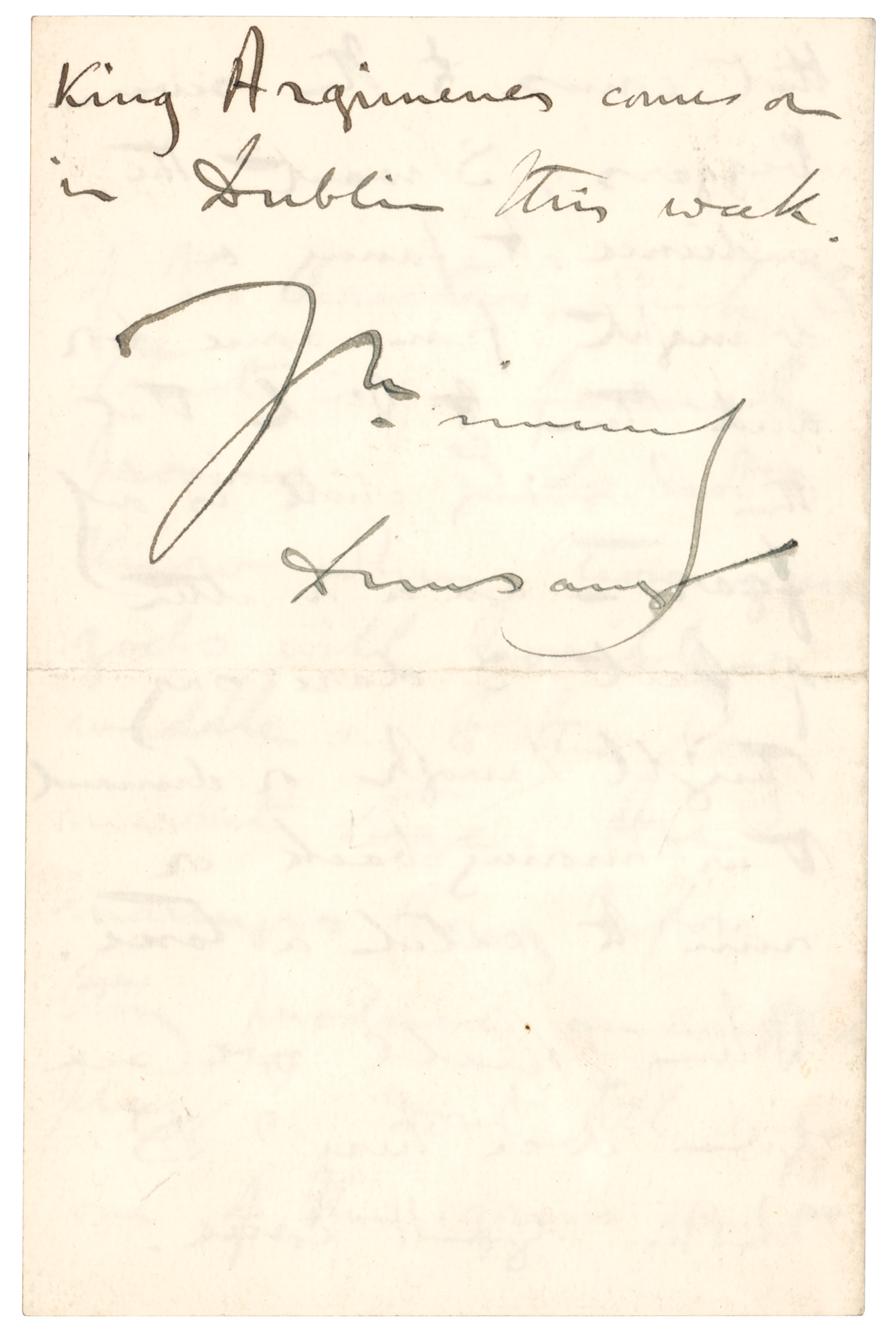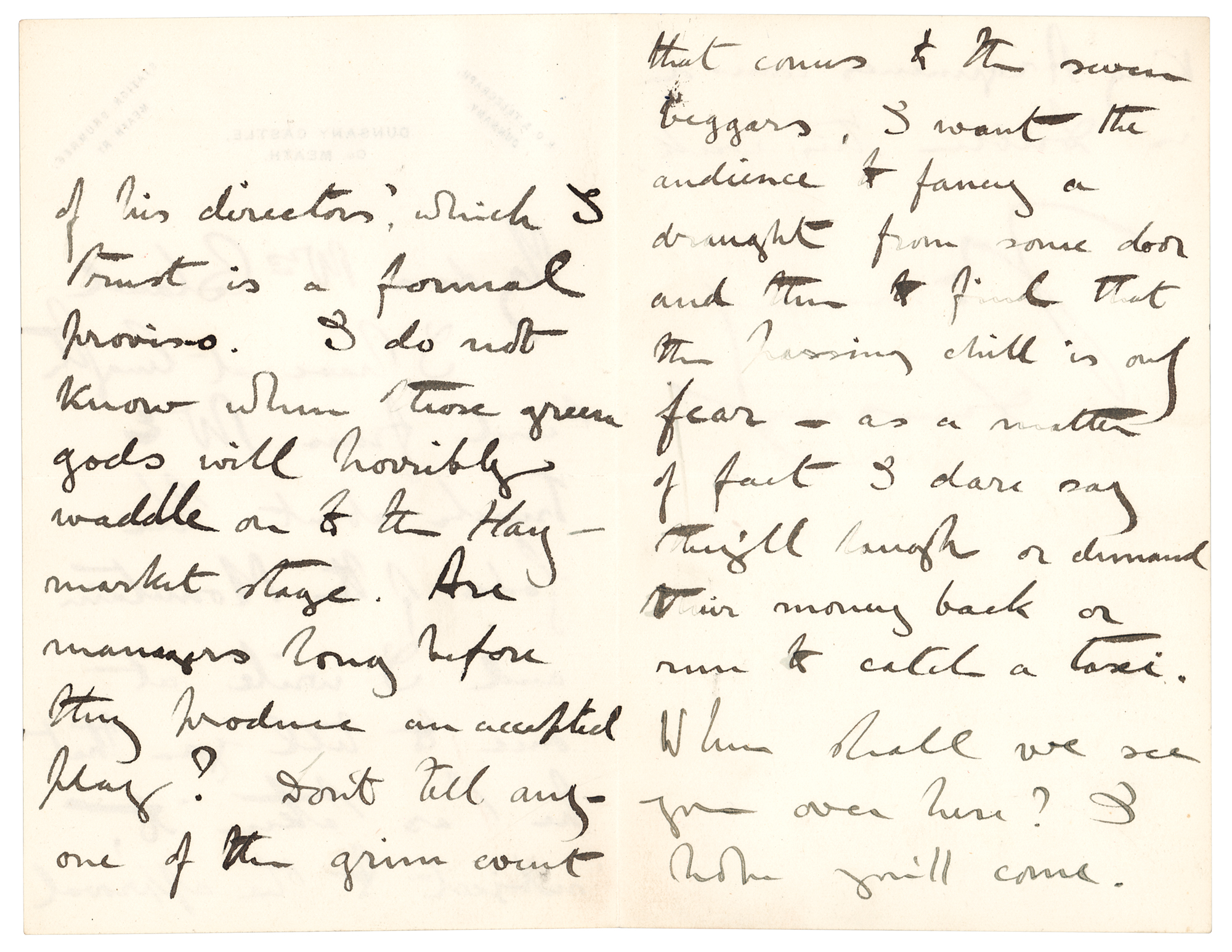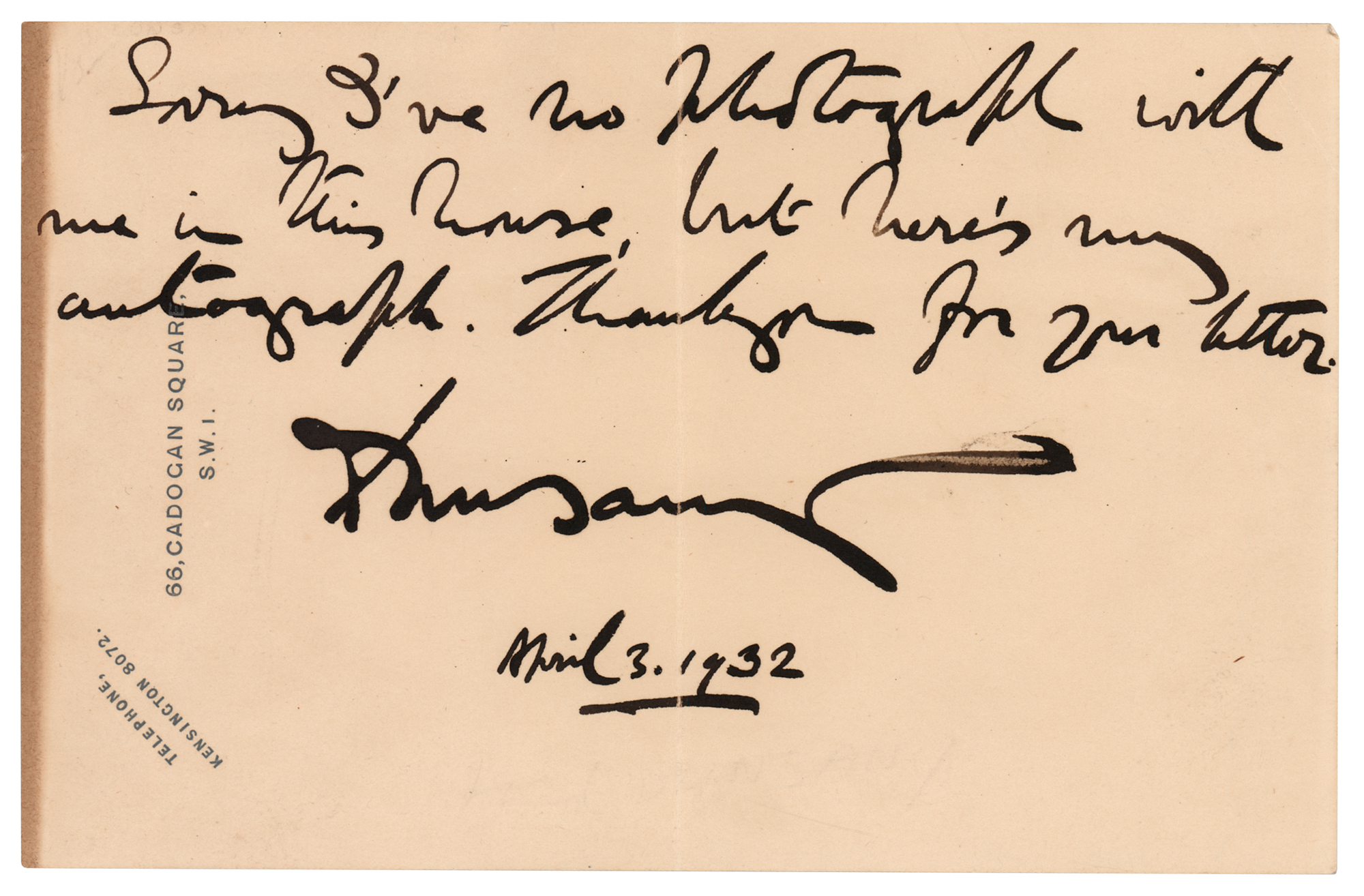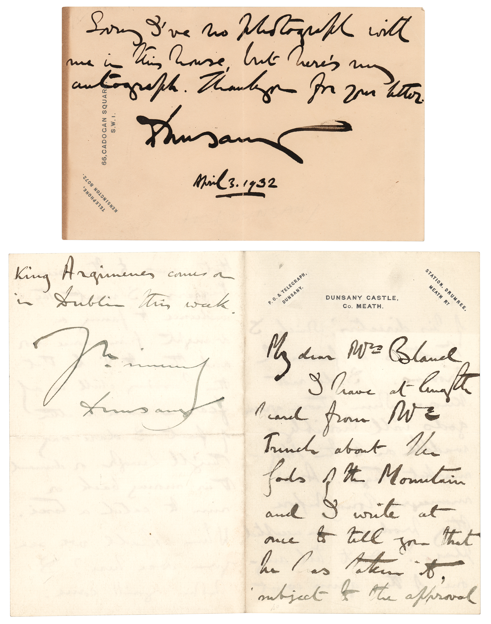 Edward John Moreton Drax Plunkett, 18th Baron of Dunsany, Irish writer and dramatist (1878-1957) notable for his work, mostly in fantasy, published under the name Lord Dunsany. Two letters: an ALS signed "Dunsany," four pages on two adjoining sheets, 4.5 x 7, Dunsany Castle letterhead, no date, in part: "I do not know when those green gods will horribly waddle on the Haymarket stage...I want the audience to fancy a draught from some door and then to find that the passing chill is only fear—as a matter of fact I dare say they'll laugh or demand their money back"; and an ANS signed "Dunsany," one page, 7 x 4.5, Cadogan Square letterhead, April 3, 1932, in part: "Sorry I've no photograph with me in this house, but here's my autograph. Thank you for your letter." In fine condition, with a thin edge stain to the shorter note.