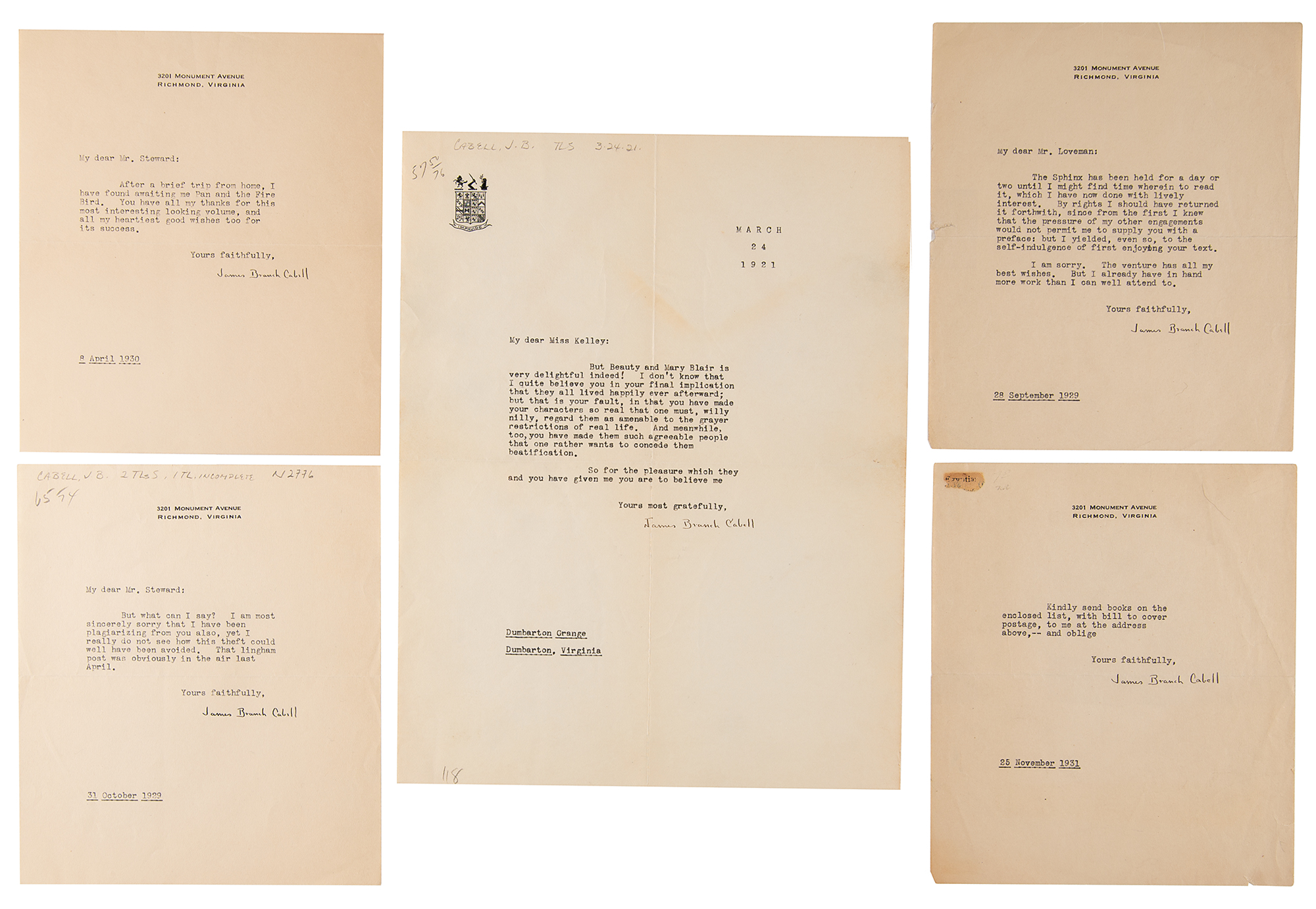 Five TLSs, each one page on personal letterhead, dated from 1921 to 1931. The first is to author Ethel May Kelley, in part: "But Beauty and Mary Blair is very delightful indeed! I don't know that I quite believe your final implication that they all lived happily ever afterward; but that is your fault, in that you have made your characters so real that one must, willy nilly, regard them as amenable to the grayer restrictions of real life. And meanwhile, too, you have made them such agreeable people that one rather wants to concede them beatification."