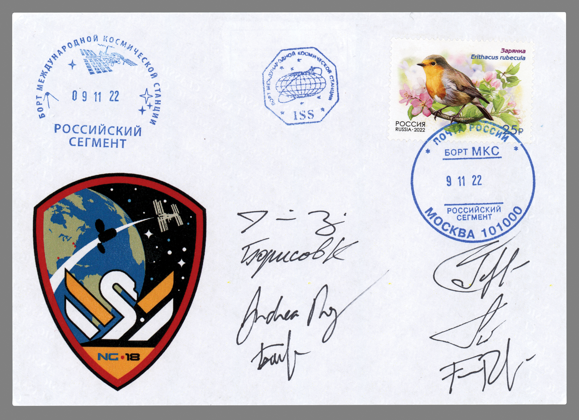 Cygnus NG-17 flown cover carried to the International Space Station, signed in space in black felt tip by the crews of SpaceX Crew-7 and Soyuz MS-22: Jasmin Moghbeli, Andreas Mogensen, Satoshi Furukawa, Konstantin Borisov, Sergey Prokopyev, Dmitry Petelin, and Francisco Rubio. The cover bears three on-board International Space Station stamps, including the postmark of the Russian segment of the ISS. In fine condition.
