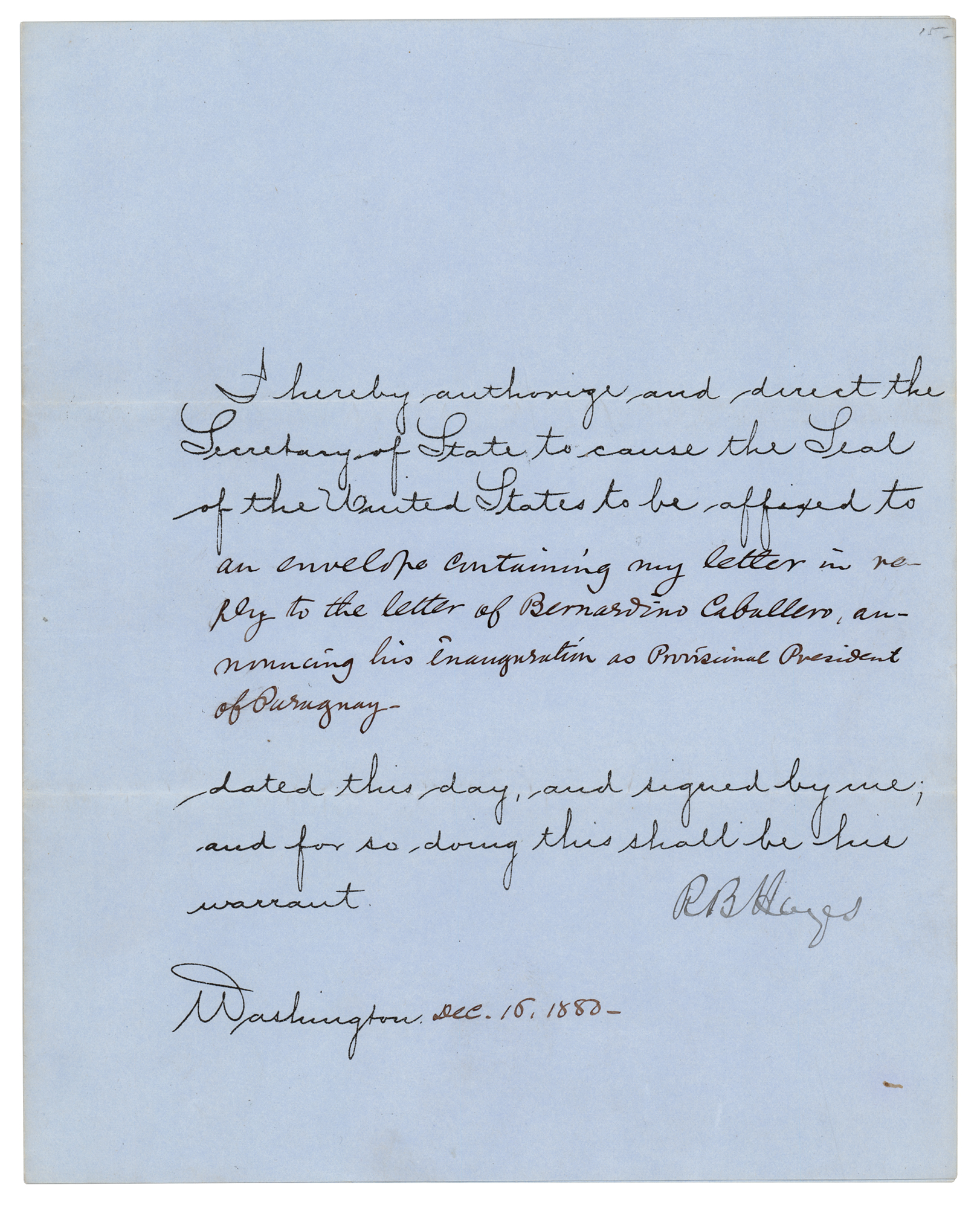 Partly-printed DS as president, signed “R. B. Hayes,” one page, 8 x 10, December 16, 1880. President Hayes directs the Secretary of State to “cause the Seal of the United States to be affixed to an envelope containing my letter in reply to the letter of Bernardino Caballero, announcing his inauguration as Provisional President of Paraguay.” Signed neatly at the conclusion by Rutherford B. Hayes. In fine condition.