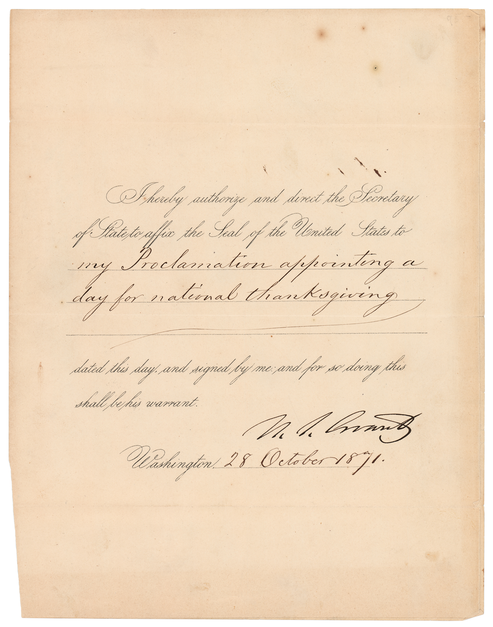 Partly-printed DS as president, one page, 8.5 x 11, October 28, 1871. President Grant directs "the Secretary of State to affix the Seal of the United States to my Proclamation appointing a day for national thanksgiving." Crisply signed at the conclusion by President Grant. In fine condition, with some light creasing and scattered foxing.