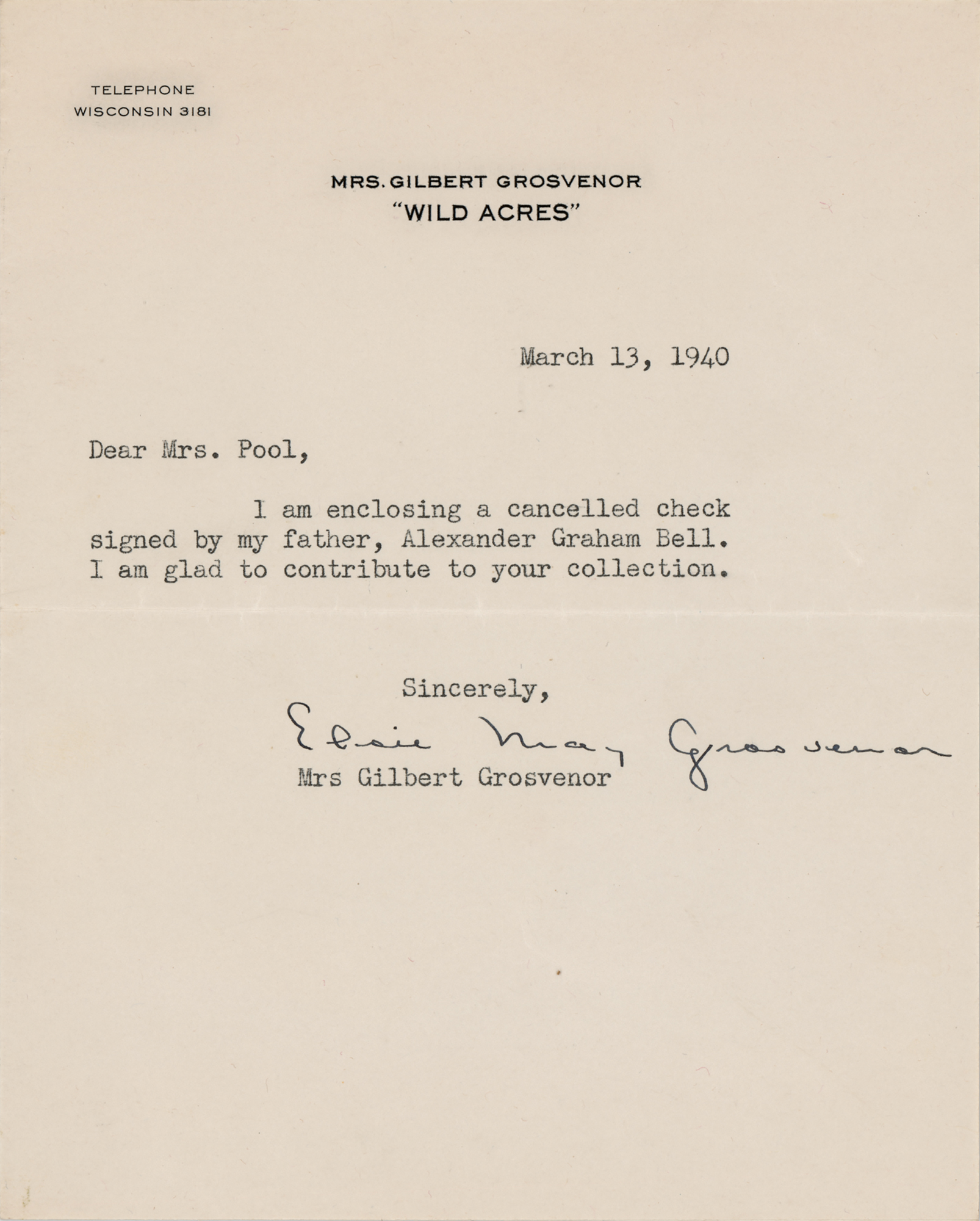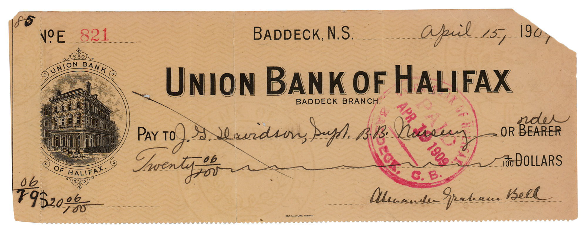 Exceptionally rare Union Bank of Halifax check, 8.25 x 3, filled out in another hand and signed by Alexander Graham Bell, payable to J. G. Davidson, superintendent of the Beinn Bhreagh Nursery for $20.06, April 15, 1909. In fine condition, with a short tear, and paper loss, to the upper right corner. Accompanied by a 1940 transmittal letter from Bell's daughter, Elsie May Grosvenor, who writes: “I am enclosing a cancelled check signed by my father, Alexander Graham Bell. I am glad to contribute to your collection.”