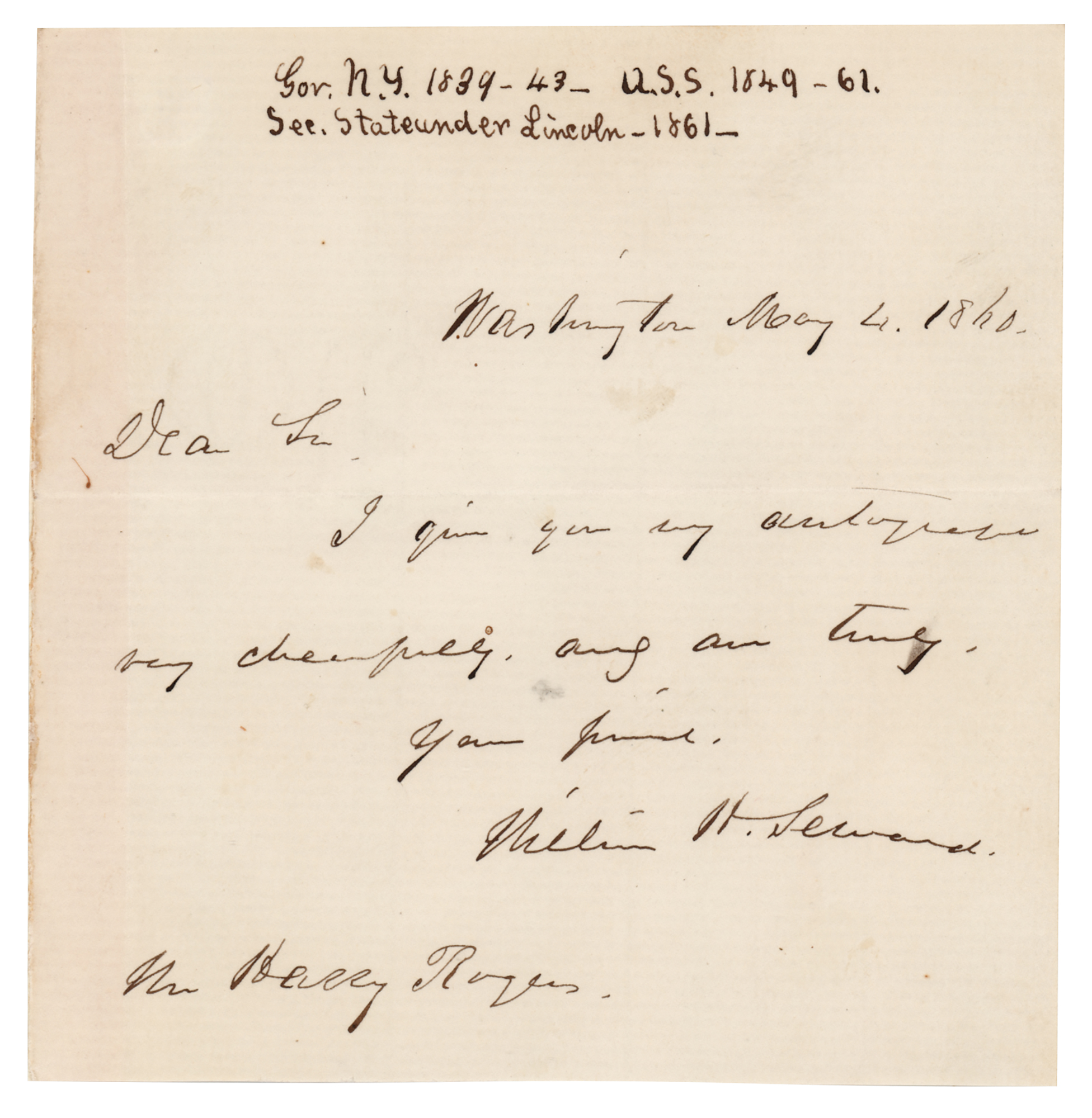 American statesman (1801–1872) who served as secretary of state in the Lincoln administration and who was severely injured in an attack that was part of the assassination conspiracy. His greatest political achievement was the purchase of Alaska from Russia, derided by contemporary skeptics as 'Seward's Folly.' ALS, one page, 4.5 x 4.5, May 4, 1860. Addressed from Washington, D.C., a brief handwritten letter to collector Harry Rogers, in full: “I give you my autograph very cheerfully, and am truly your friend.” In fine condition, with faint show-through along the left edge from an old mounting strip on the back.