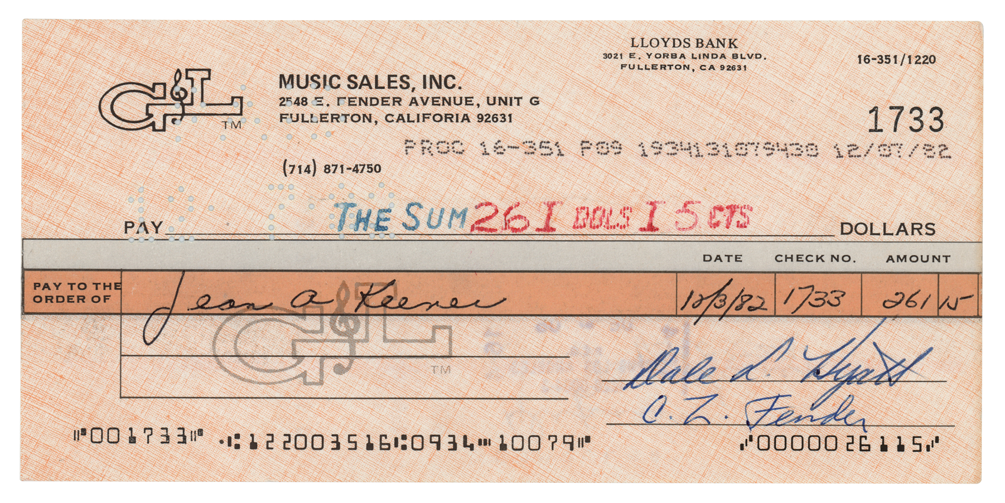 American inventor (1909–1991) who founded Fender Electric Instrument Manufacturing Company, and is remembered for designing the Telecaster, Stratocaster, and Precision Bass. G&L Music Sales business check, 7.25 x 3.5, filled out in another hand and signed by Leo Fender ("C. L. Fender") and Dale Hyatt ("Dale L. Hyatt"), payable to Jean A. Keener for $261.15, December 7, 1982. In fine condition.