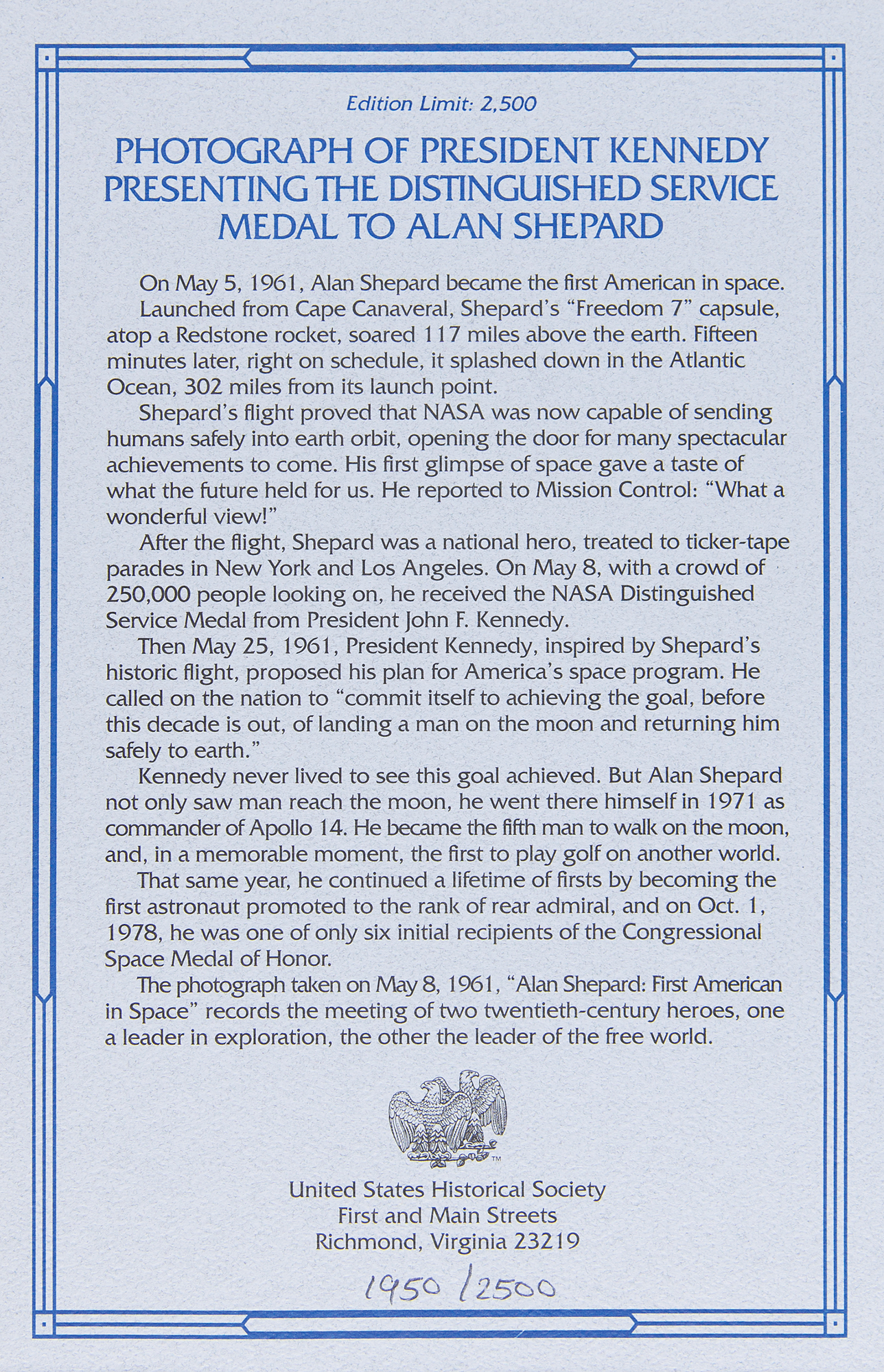 Limited edition color glossy 9.25 x 7.25 cardstock photo of Alan Shepard receiving the NASA Distinguished Service Medal from President Kennedy on May 8, 1961, signed in black ink by Shepard. Matted to an overall size of 14 x 11, with mat numbered 1950/2500. In fine condition. Accompanied by an authentication sheet with a matching edition number.