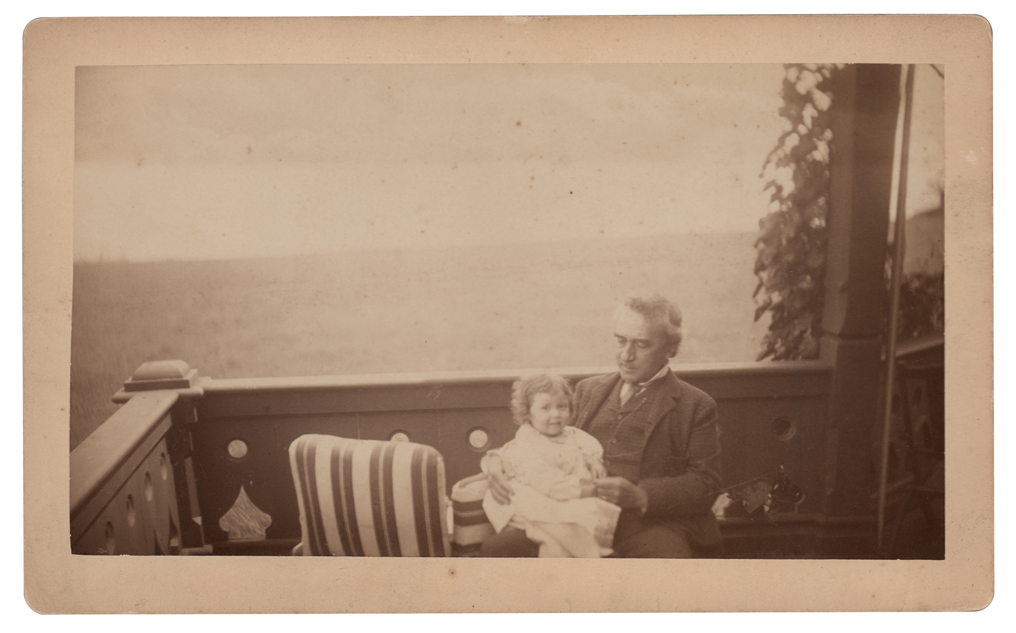 Famed stage actor (1833–1893) who toured the United States and Europe performing the plays of Shakespeare; his legacy as the greatest American actor of the 19th century has been overshadowed by that of his brother, John Wilkes Booth, assassin of President Abraham Lincoln. Heartwarming original vintage 8.5 x 5.25 mounted albumen photograph of Edwin Booth with his granddaughter, Mildred, sitting on a seaside porch. In fine condition. Originates directly from the collection of the great-great granddaughter of Edwin Booth.