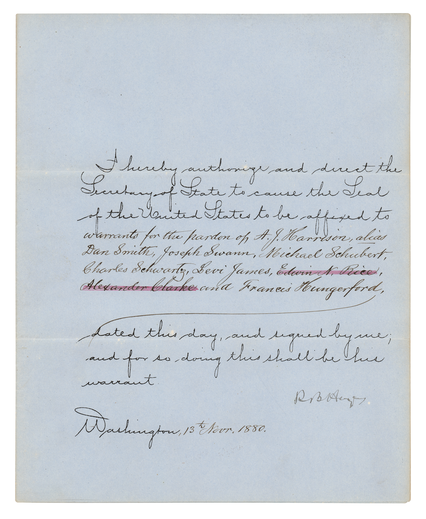 Partly-printed DS as president, signed “R. B. Hayes,” one page, 8 x 10, November 13, 1880. President Hayes directs the Secretary of State to “cause the Seal of the United States to be affixed to “warrants for the pardon of A. J. Harrison, alias Dan Smith, Joseph Swann, Michael Schubert, Charles Schwartz, Levi James, and Francis Hungerford.” Two of the names, “Edwin N. Rice” and “Alexander Clarke,” have been struck through in red ink. Signed neatly at the conclusion by Rutherford B. Hayes. In fine condition.