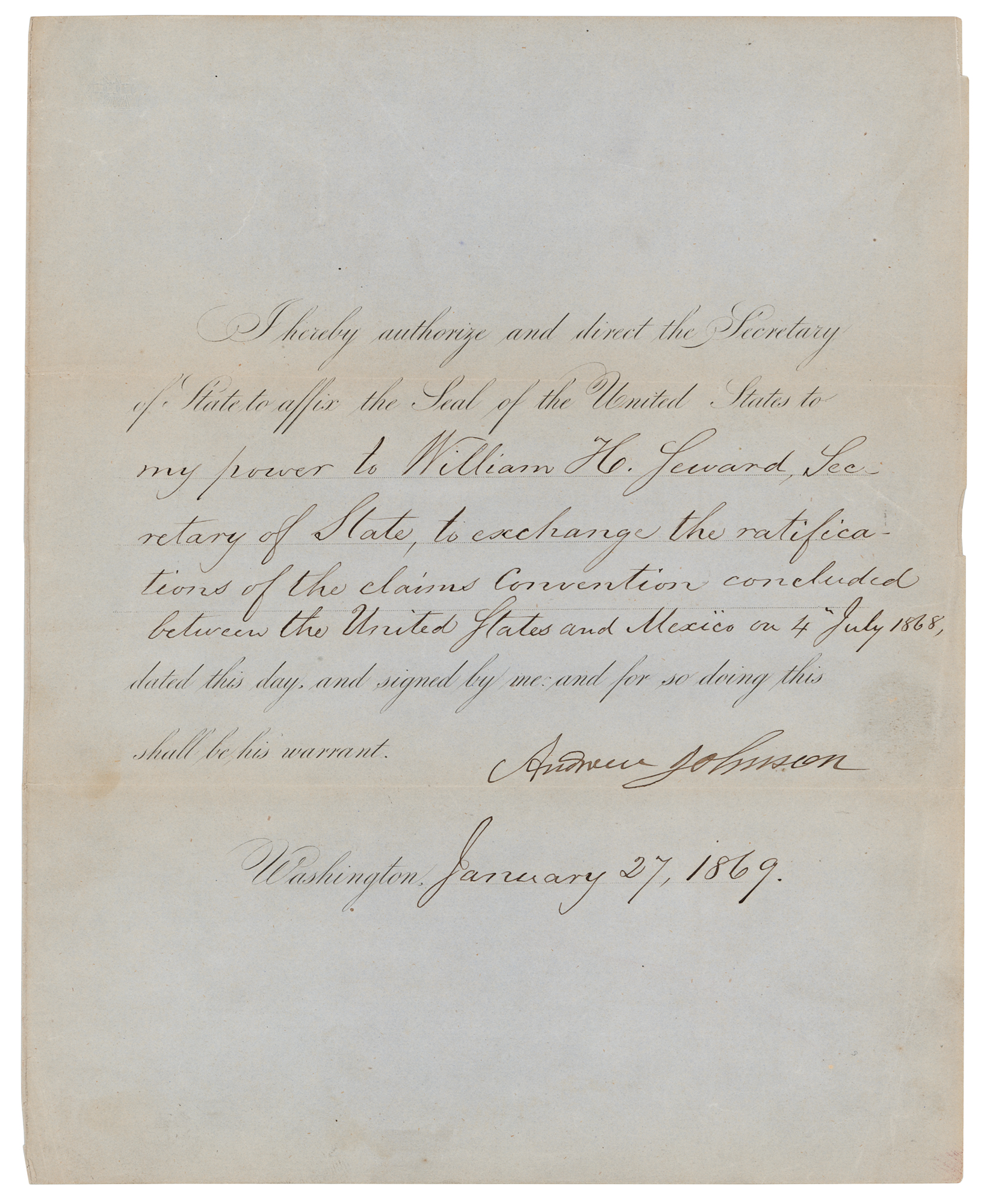 Partly-printed DS as president, one page, 8 x 10, January 27, 1869. President Johnson directs the Secretary of State to affix the Seal of the United States to “my power to William H. Seward, Secretary of State, to exchange the ratifications of the claims Convention concluded between the United States and Mexico on 4 July 1868.” Signed neatly at the conclusion by Andrew Johnson. In fine condition, with very faint toning to the folds and edges.
