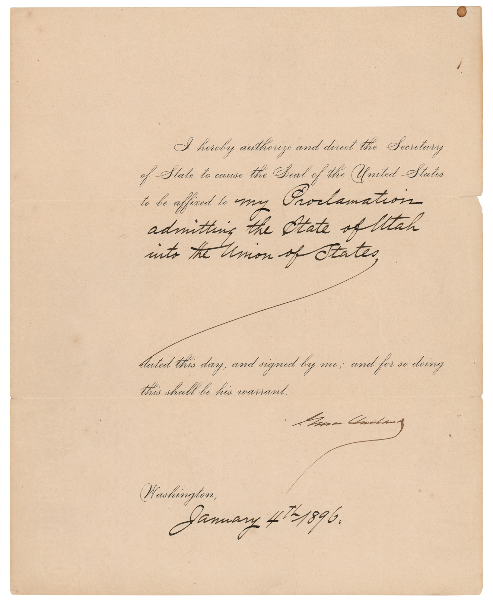 Partly-printed DS as president, one page, 8 x 10, January 4, 1896. President Cleveland directs the Secretary of State to “cause the Seal of the United States to be affixed to my Proclamation admitting the State of Utah into the Union of States.” Signed neatly at the conclusion by Grover Cleveland. In fine condition.