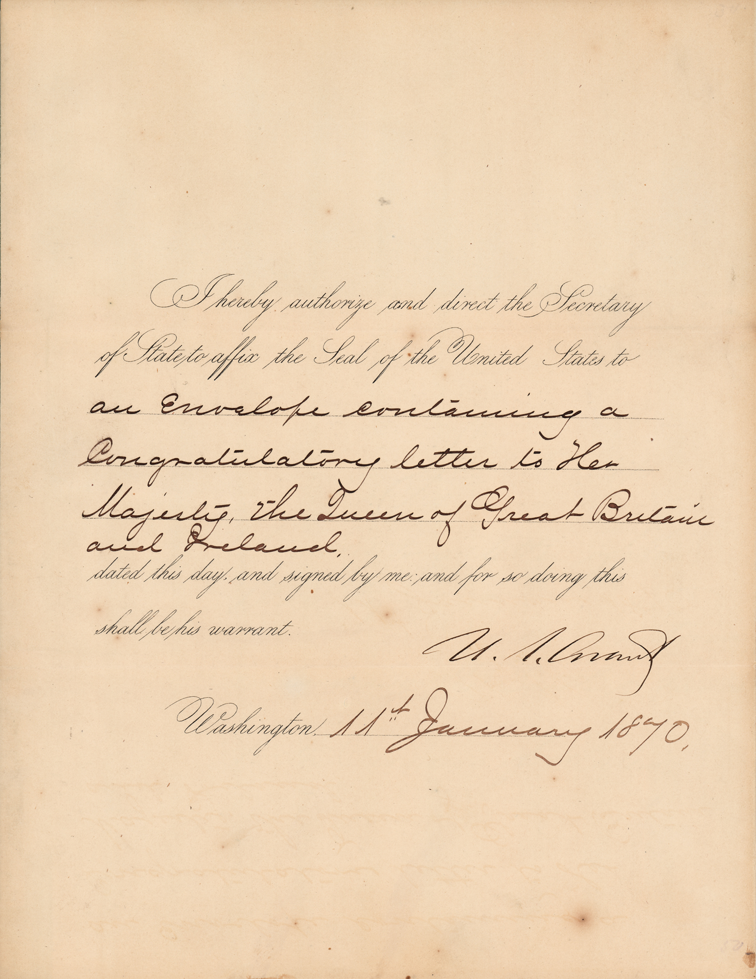 Partly-printed DS as president, one page, 8.5 x 11, January 11, 1870. President Grant directs the Secretary of State to “affix the Seal of the United States to an envelope containing a Congratulatory letter to Her Majesty, the Queen of Great Britain and Ireland.” Signed crisply at the conclusion by U. S. Grant. Affixed inside a presentation folder, which also bears a descriptive statement in an unknown hand: “Jan. 11th, 1870, Answer to a letter of Her Majesty Queen Victoria announcing the Birth of Princess to the Princess of Wales.” In fine condition, with a few small spots of foxing.