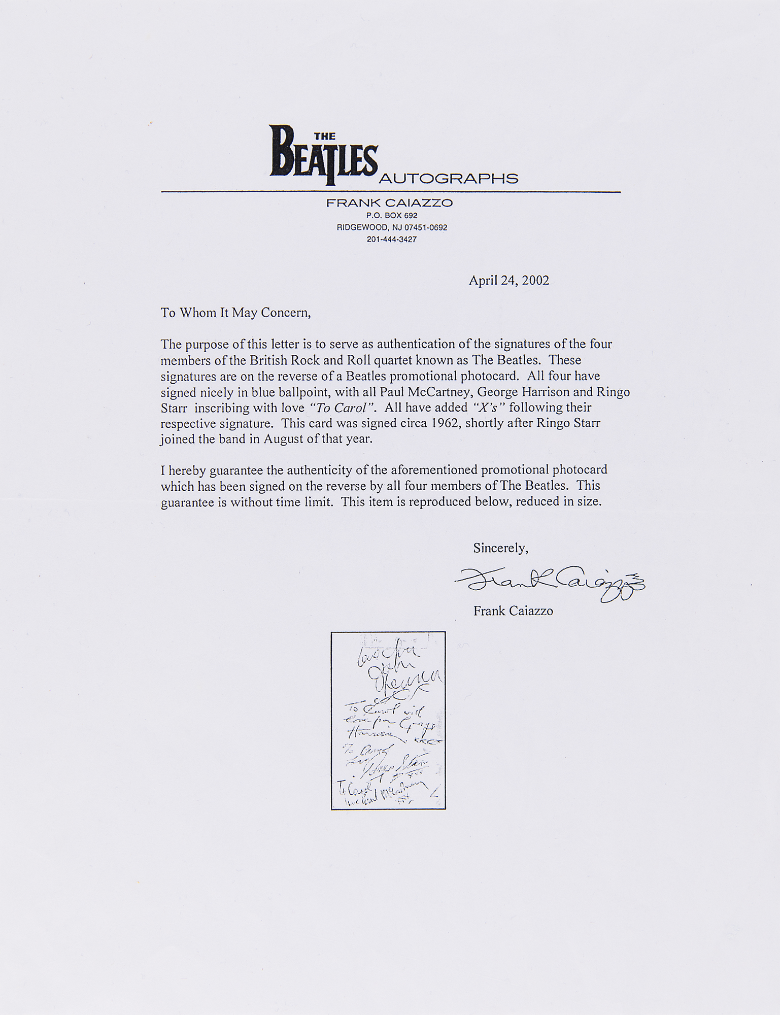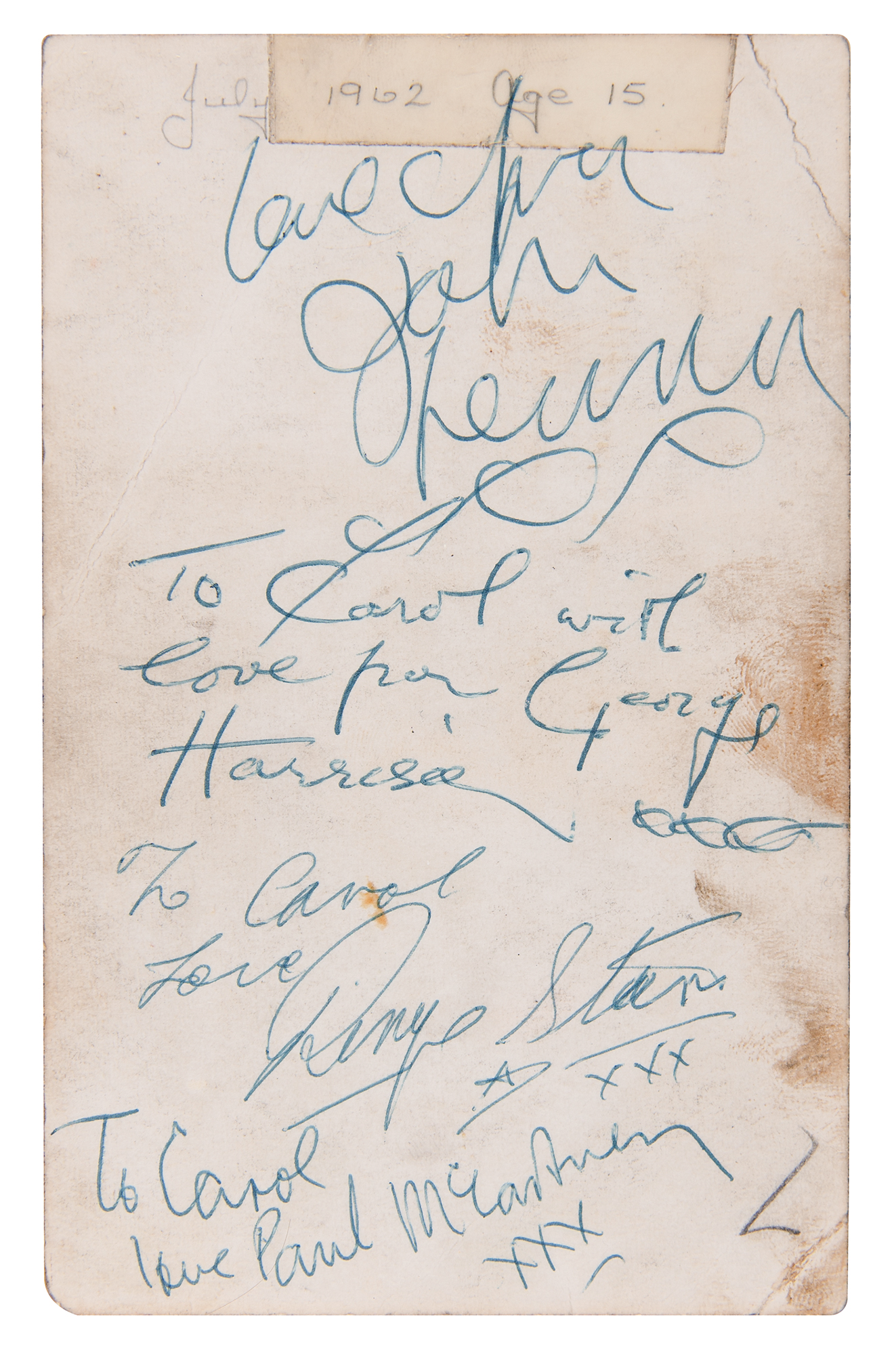 Ultra-early vintage ballpoint signatures and inscriptions, "Love from John Lennon, xxx," "To Carol with love from George Harrison, xxxx," "To Carol, Love, Ringo Starr, xxx," and "To Carol, love Paul McCartney, xxx," on the reverse of a 3.5 x 5.5 photo of a British teenager in her yard, annotated at the top, "July 1962 - Age 15." On the front, over the image, is a vintage newspaper clipping offering brief biographical information on each of the Beatles. In very good condition, with staining and soiling, corner creases, and old tape from a clipping on the photo side touching Lennon's sentiment. Accompanied by a photocopy of a letter of authenticity from noted Beatles expert Frank Caiazzo, noting: "This card was signed circa 1962, shortly after Ringo Starr joined the band in August of that year."