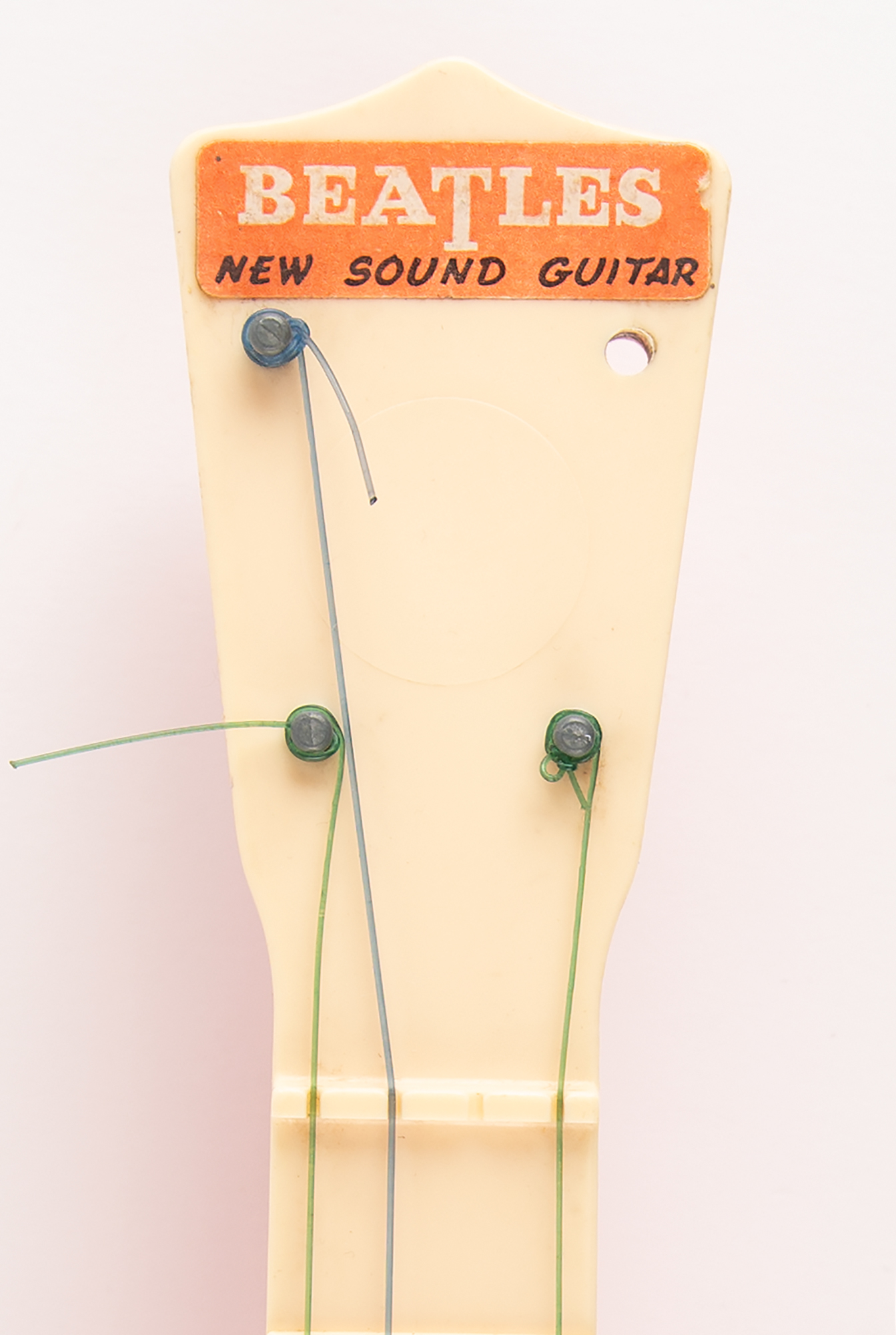 Uncommon vintage plastic Beatles "New Sound Guitar" made by Selcol, circa 1964, measuring approximately 23˝ long, 8˝ across, and 2˝ deep, with portraits of each band member—John Lennon, Paul McCartney, George Harrison, and Ringo Starr—on the body, with their facsimile signatures below. In very good to fine condition, with a single string and its associated tuning peg missing.