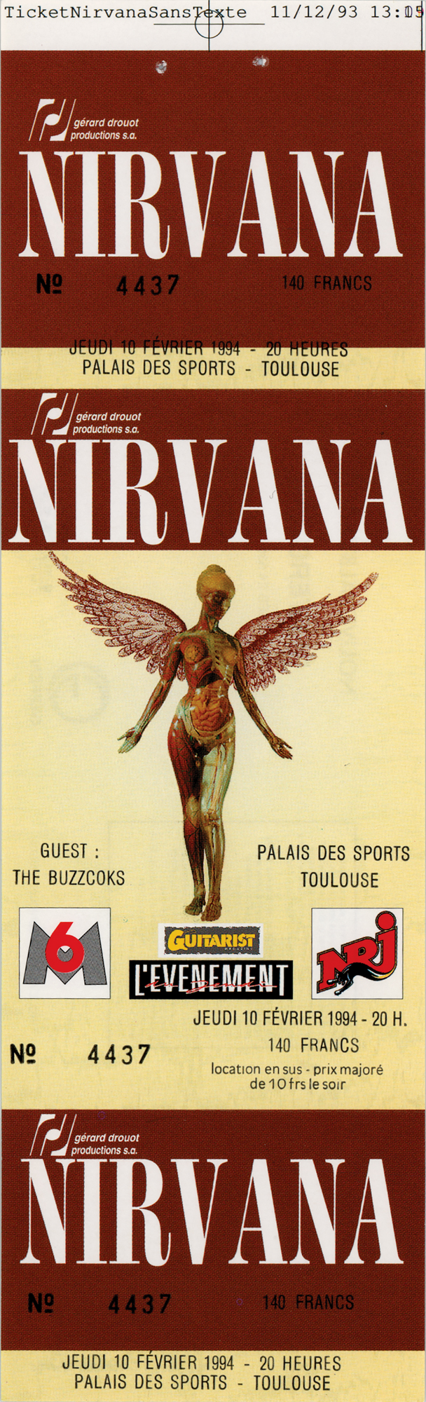 Original full 2.5 x 8.5 concert ticket for Nirvana's show at the Palais des Sports in Toulouse, France, on February 10, 1994, as part of the European leg of their 'In Utero' tour, marked as "No. 4437." In very fine condition.