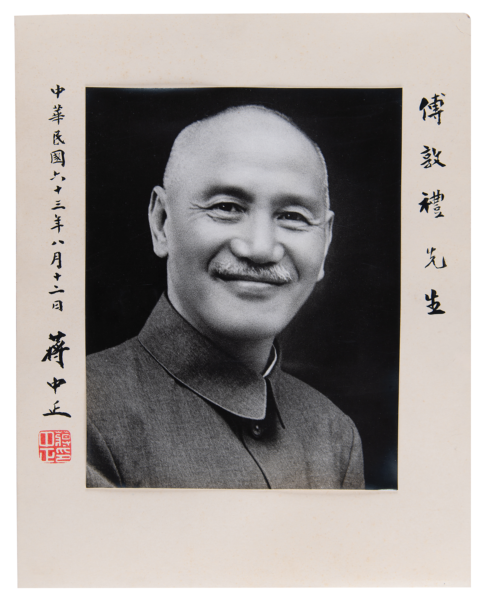 Scarce oversized semi-glossy 7.5 x 9.5 photo of Chiang Kai-shek, affixed to its original 11 x 13.75 mount, signed and inscribed on the mount in black ink in Chinese. The reverse of the photo bears a Hu Chung Hsien photography stamp. In fine condition, with light silvering to the edges of the slightly curled image. An exceptional portrait of the Chinese leader, very scarce in this large-format size.