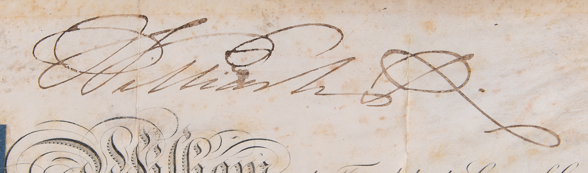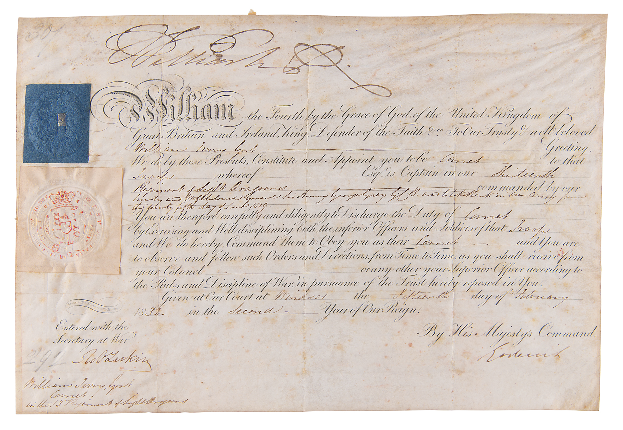 King of Great Britain and Ireland (1765–1837) from 1830 to 1837, he earned the sobriquet 'Sailor King' for his youthful service in the Royal Navy. Partly-printed vellum DS, signed “William R,” one page, 13.5 x 9, February 15, 1832. King William IV appoints William Terry "to be Cornet to that Troop...in our Thirteenth Regiment of Light Dragoons." Prominently signed at the head by King William IV. The seals affixed to the left side remain intact. In very good to fine condition, with overall wrinkling and foxing.