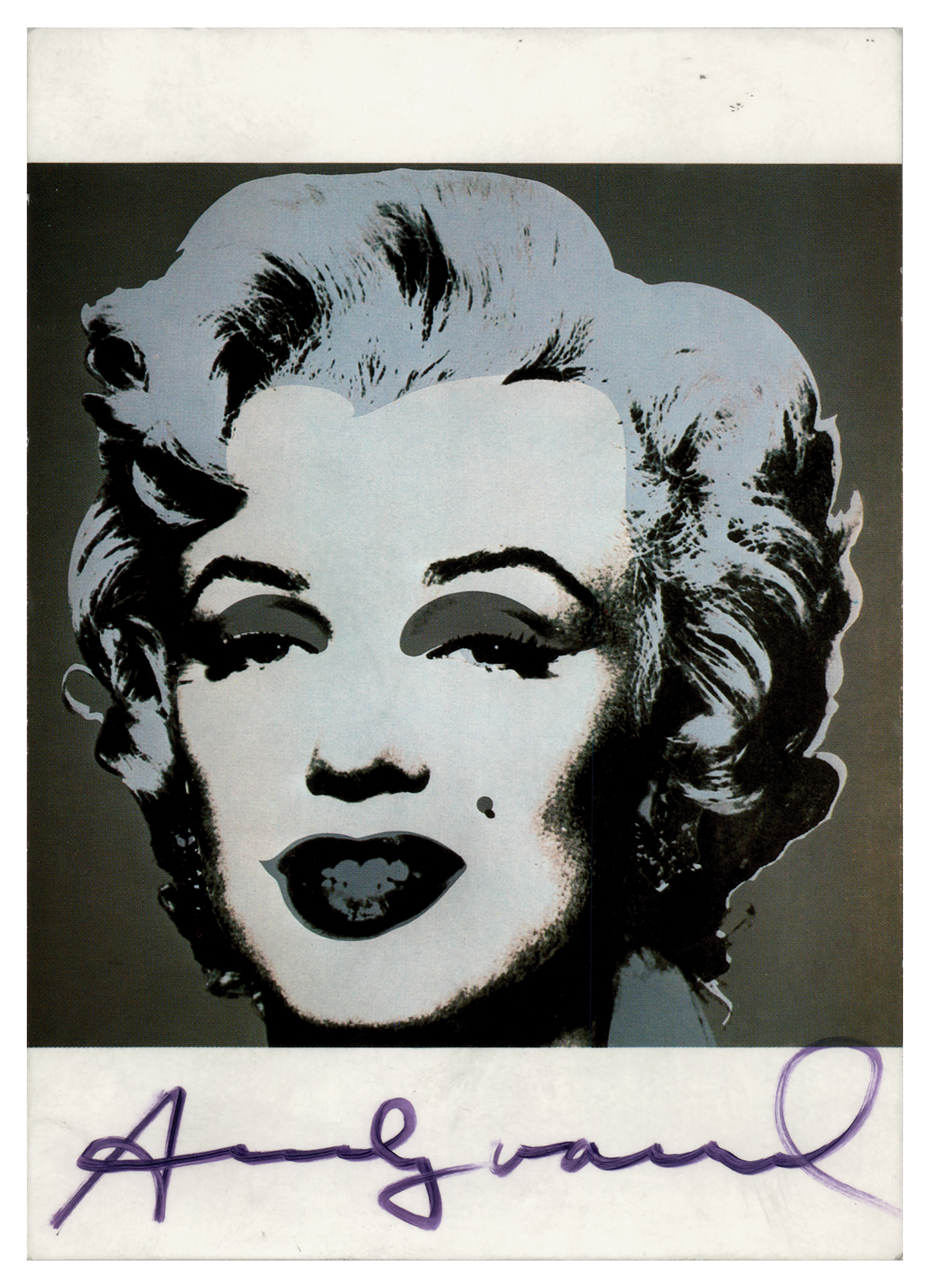 Iconic postcard depicting one of Andy Warhol's portraits of Marilyn Monroe, 4.25 x 6, signed in the lower border in black felt tip. In fine condition.