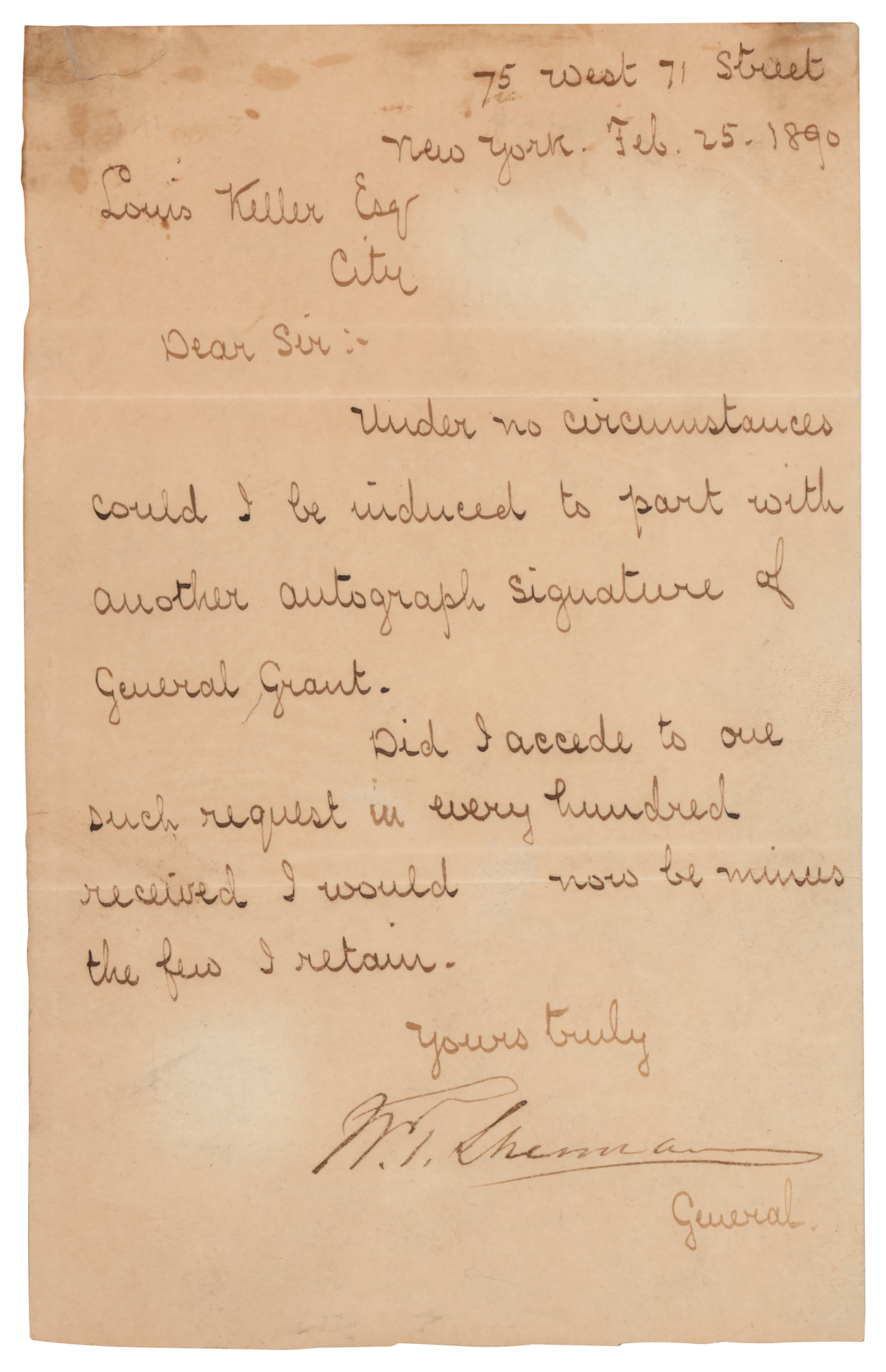 LS signed “W. T. Sherman,” one page, 4.75 x 7.75, February 25, 1890. Letter to Louis Keller, Esq., sent from New York, in full: "Under no circumstances could I be induced to part with another autograph signature of General Grant. Did I accede to one such request in every hundred received I would now be minus the few I retain." In very good to fine condition, with lightly trimmed edges, and staining to the top edge from old mounting residue on the back. Accompanied by an engraved portrait of General William T. Sherman.