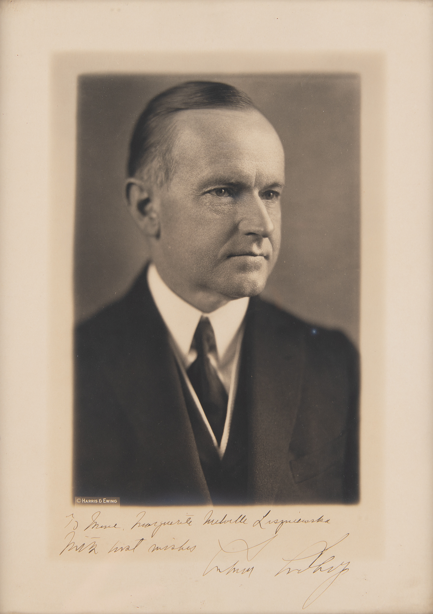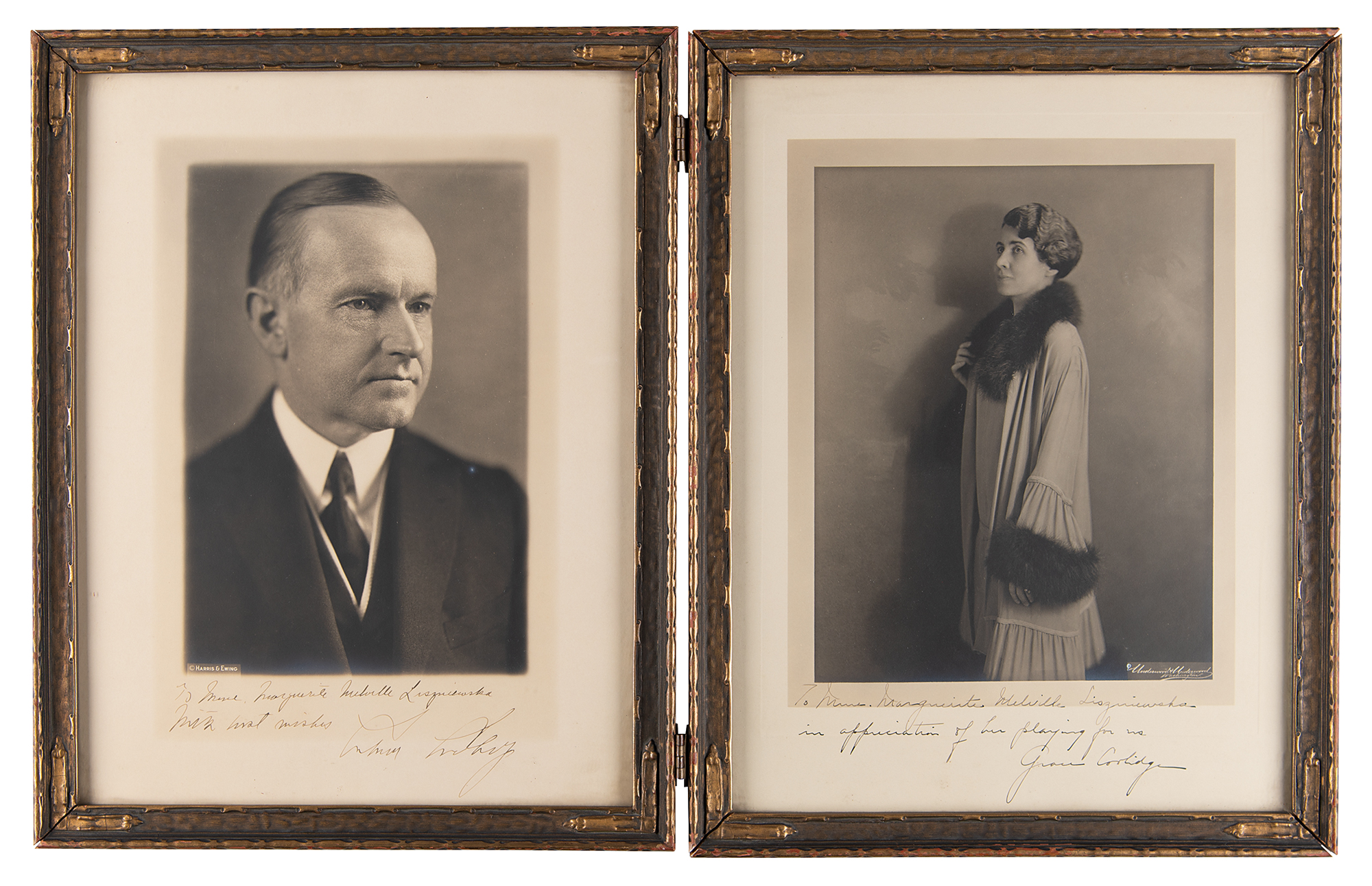 Two vintage circa 1926 matte-finish 9.75 x 13.75 photographic portraits of President Calvin Coolidge (by Harris & Ewing) and First Lady Grace Coolidge (by Underwood & Underwood), each signed and inscribed in the lower border to pianist and composer Mme. Marguerite Melville Liszniewska: "To Mme. Marguerite Melville Liszniewska, With best wishes, Calvin Coolidge," and "To Mme. Marguerite Melville Liszniewska, in appreciation of her playing for us, Grace Coolidge." Although undated, the photographs were undoubtedly signed in 1926 as that is when Liszniewska played for the Coolidges at the White House. The photographs are housed in an attractive hinged art-nouveau style double-frame. In overall fine condition.