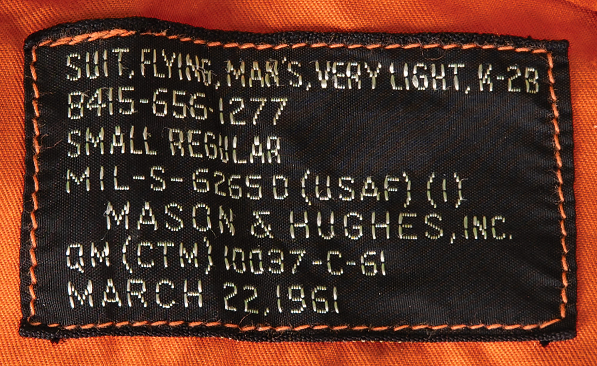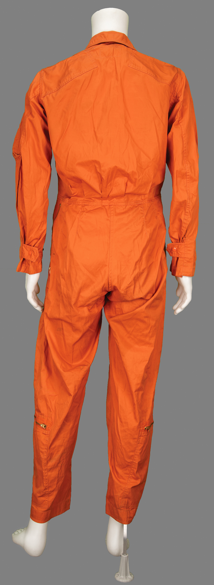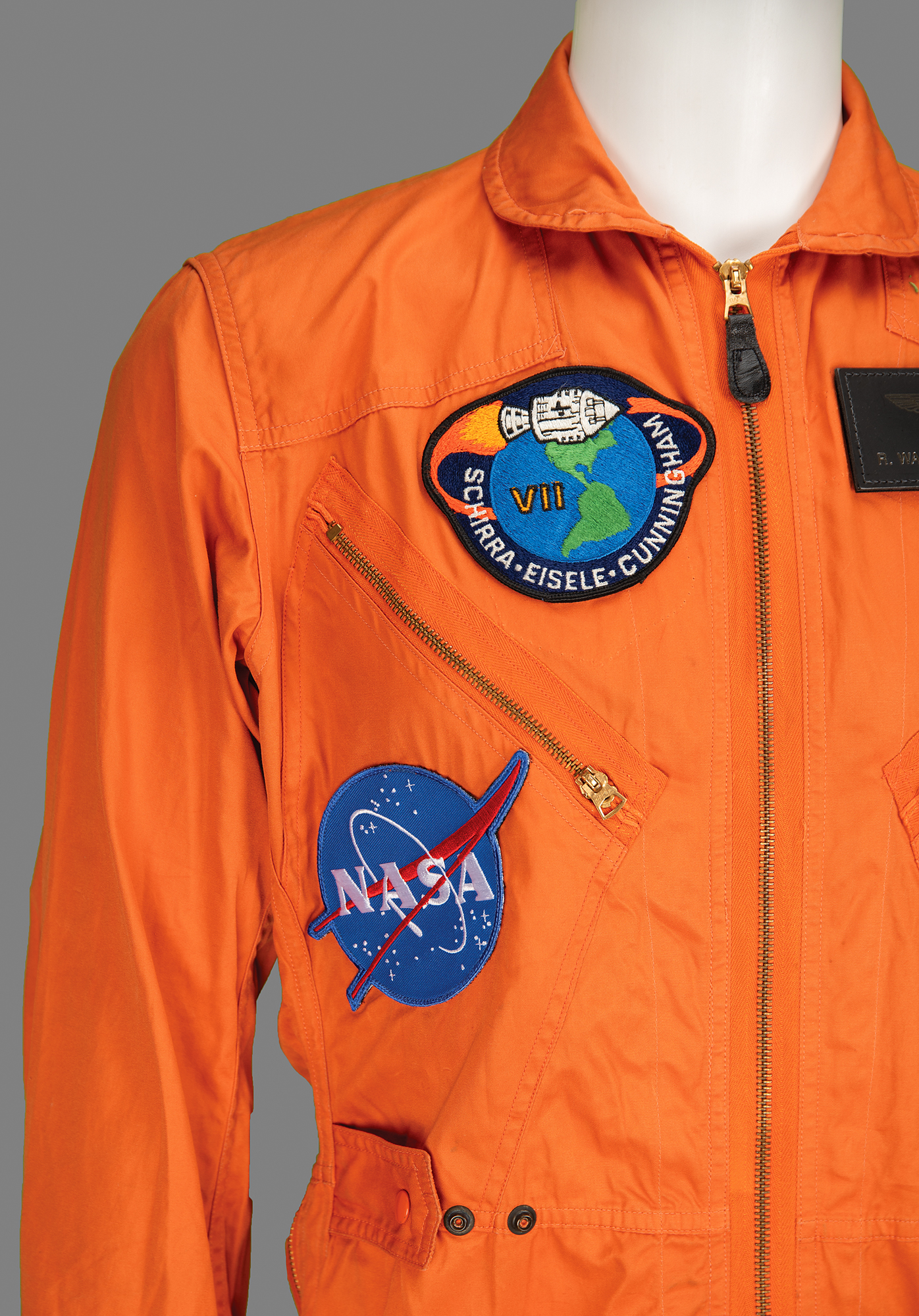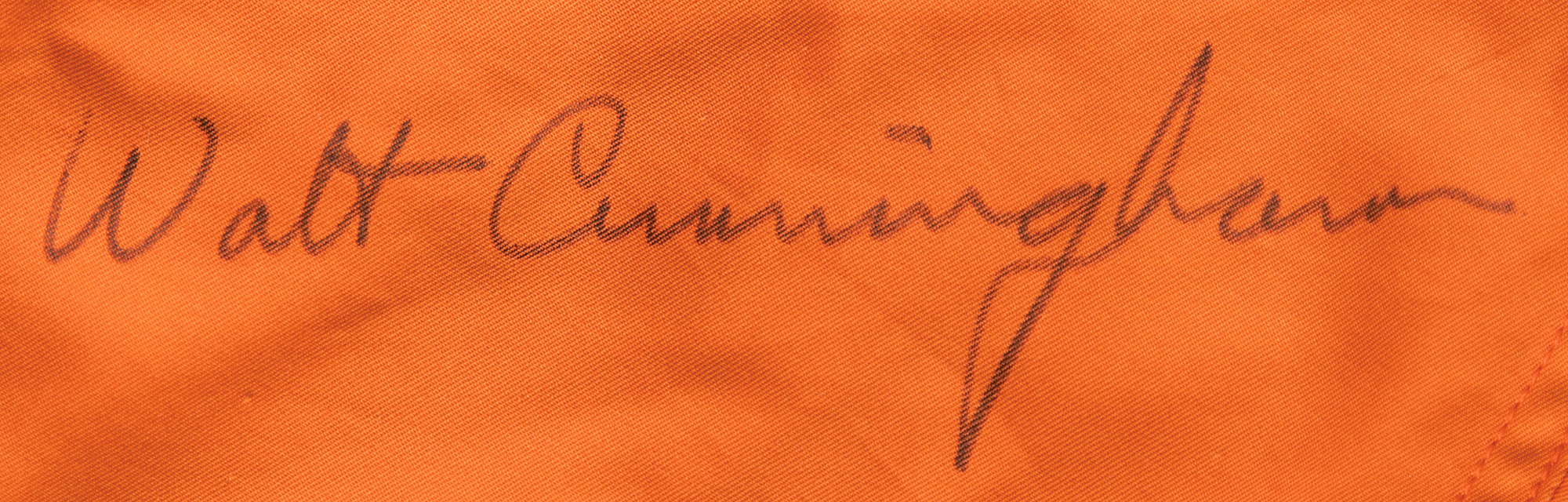 Bright orange Vietnam-era military-issued K-2B coveralls flight suit, size small regular, signed on the left chest area in black felt tip by Walt Cunningham, whose leather name patch is affixed above. The right chest area bears embroidered Apollo 7 and NASA ‘meatball’ patches, and the inner collar retains the original Mason & Hughes, Inc. label: “Suit, Flying, Man’s, Very Light, K-28, 8415-656-1277…Mil-S-6265 D (USAF) (1)…March 22, 1961.” In fine condition.