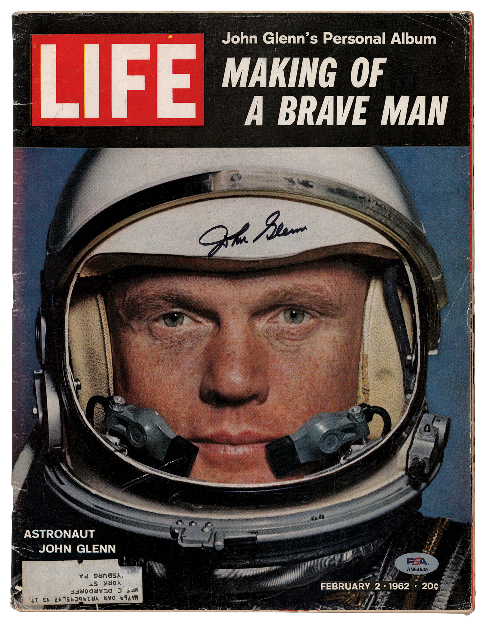 Issue of Life magazine from February 2, 1962, 98 pages, 10.5 x 13.75, the front cover featuring a close-up image of John Glenn in his Mercury space helmet, signed in black felt tip. In fine condition, with wear to edges, and a PSA label affixed to the lower right corner.