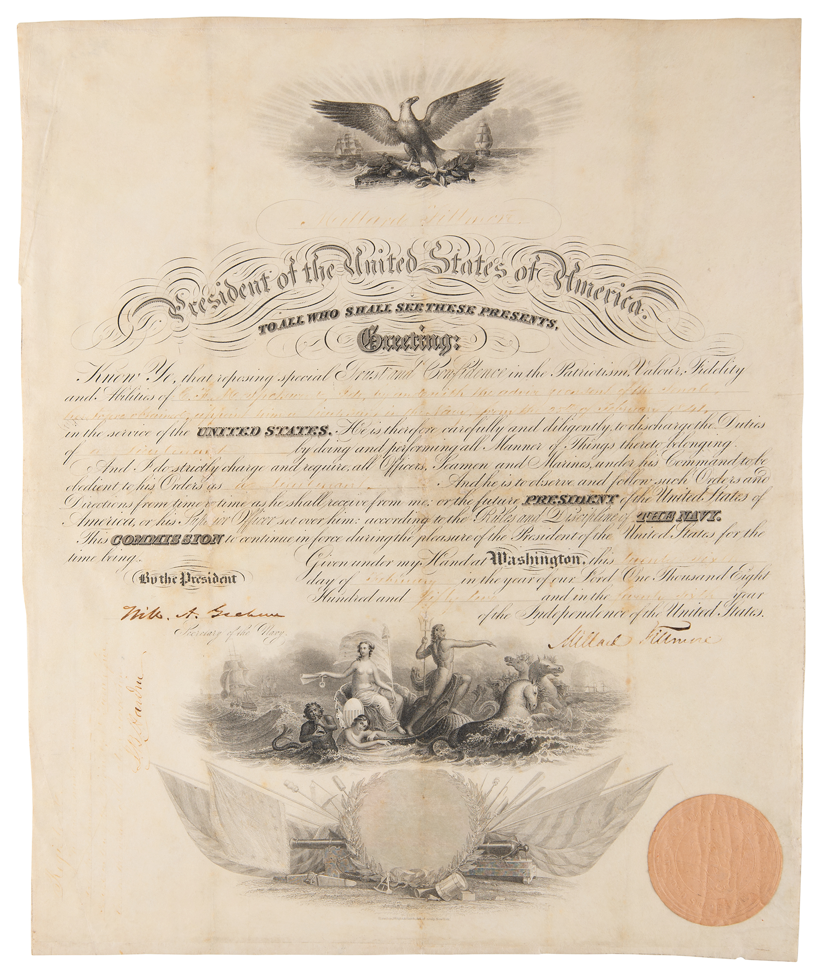 Partly-printed vellum DS as president, one page, 14.75 x 17.75, February 26, 1852. President Fillmore appoints C. F. M. Spotswood "as a Lieutenant in the Navy…in the service of the United States." Signed at the conclusion in ink by Millard Fillmore, and countersigned by Secretary of the Navy William A. Graham. The beige Navy Department seal is affixed to the lower right. In very good to fine condition, with light staining, and small repairs, along the intersecting folds.