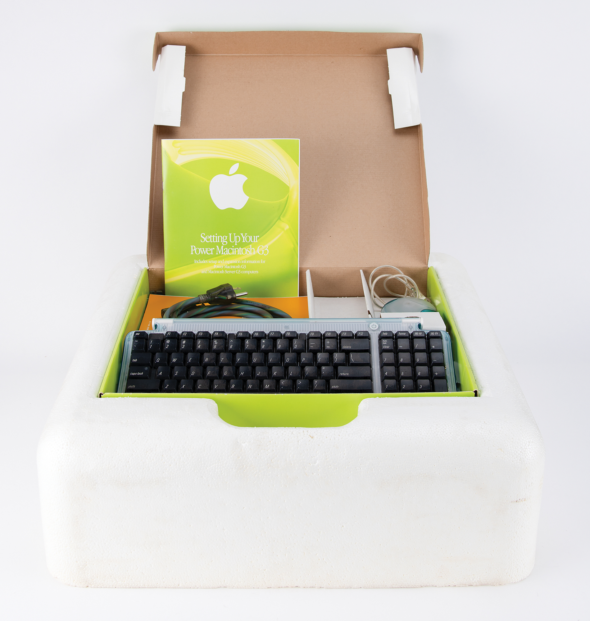 Apple Power Macintosh G3 desktop personal computer in blue and white, Part No. M6668LL/A, Serial No. XB913054G9C, complete in its original packaging. The computer features a 350MHZ processor, 512MB SDRAM [upgraded], 6GB hard drive, DVD-ROM, ATI RAGE 128 graphics card, and aftermarket upgrades including an ATI Xclaim card and Media 100 card. Complete with its Power Macintosh G3 Accessory Kit, containing a matching Apple USB Keyboard, Apple USB 'Hockey Puck' Mouse, power cord, microphone, and setup/troubleshooting guides. Tested to be in working condition, running OS 9.2; in fine cosmetic condition, with light general wear from use. Includes a matching Epson Stylus Color 740i Printer, in its original box.