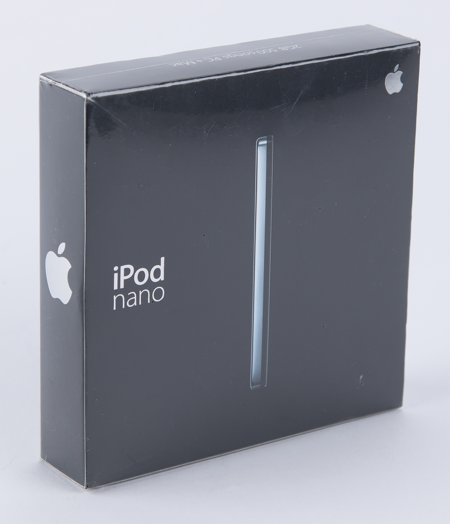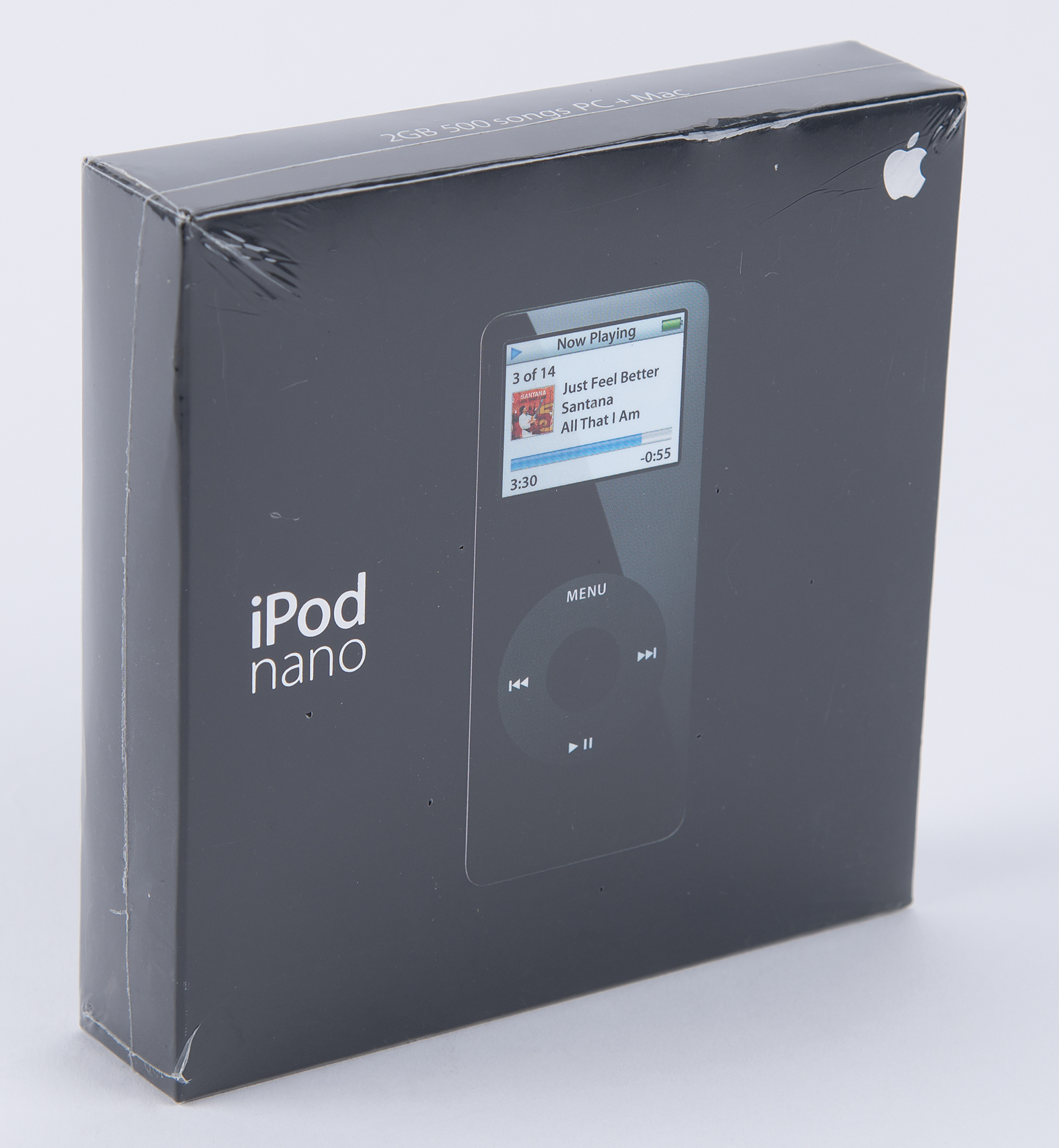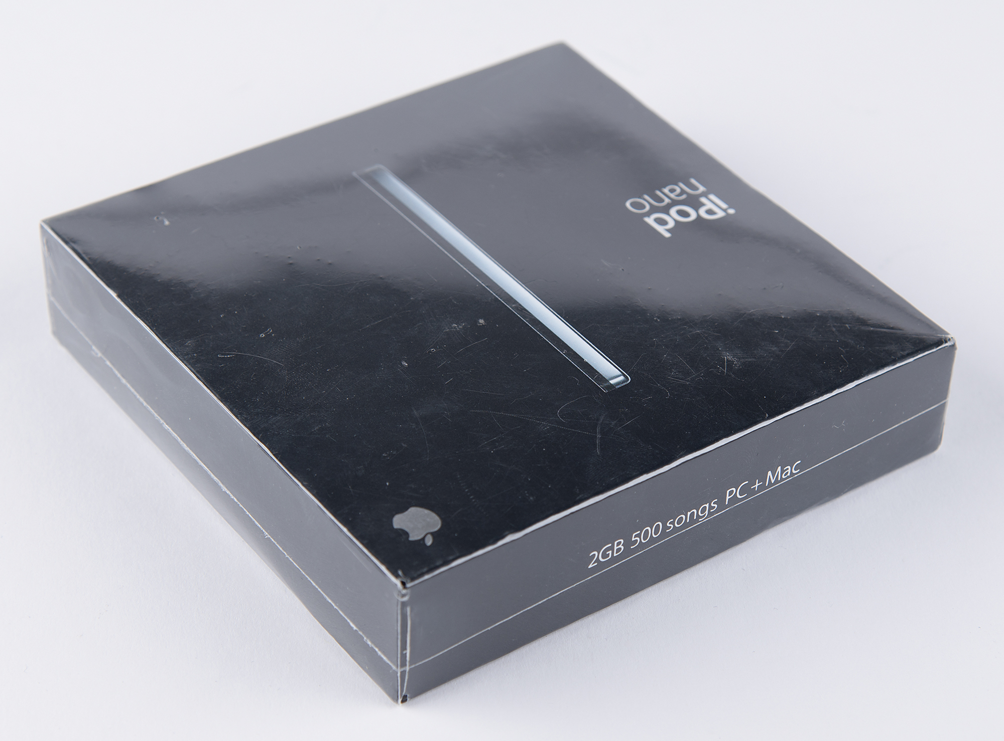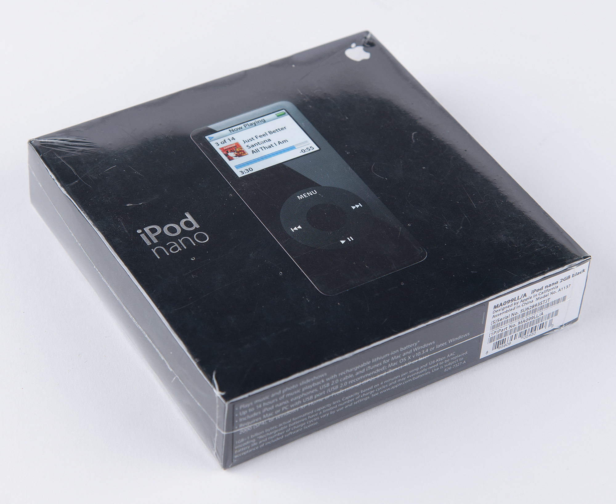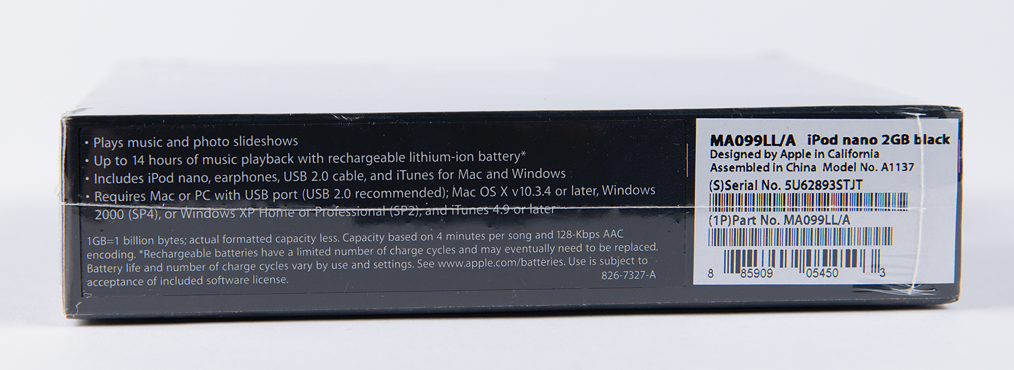 Unopened first generation original black Apple iPod Nano, Part No. MA099LL/A (2GB), Serial No. 5U62893STJT. The front and back of the box feature life-size images of the audio player, and the sides feature the silver Apple logo, text, “2GB 500 songs PC + Mac,” and specifications. In brand new, factory-sealed condition.