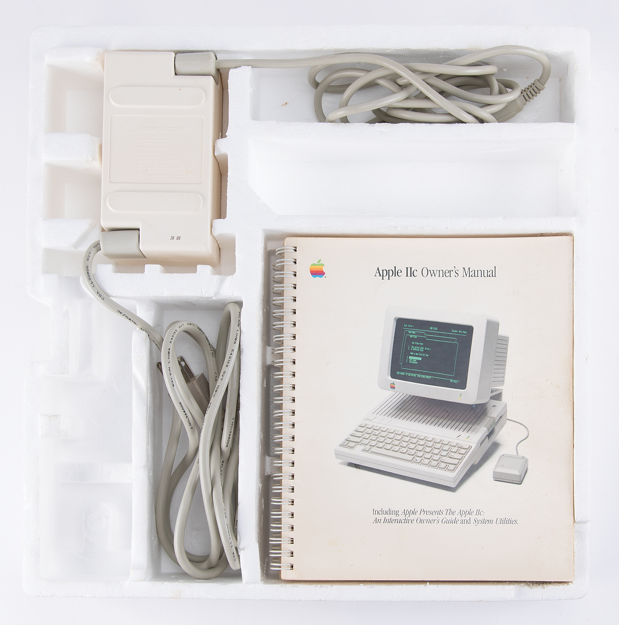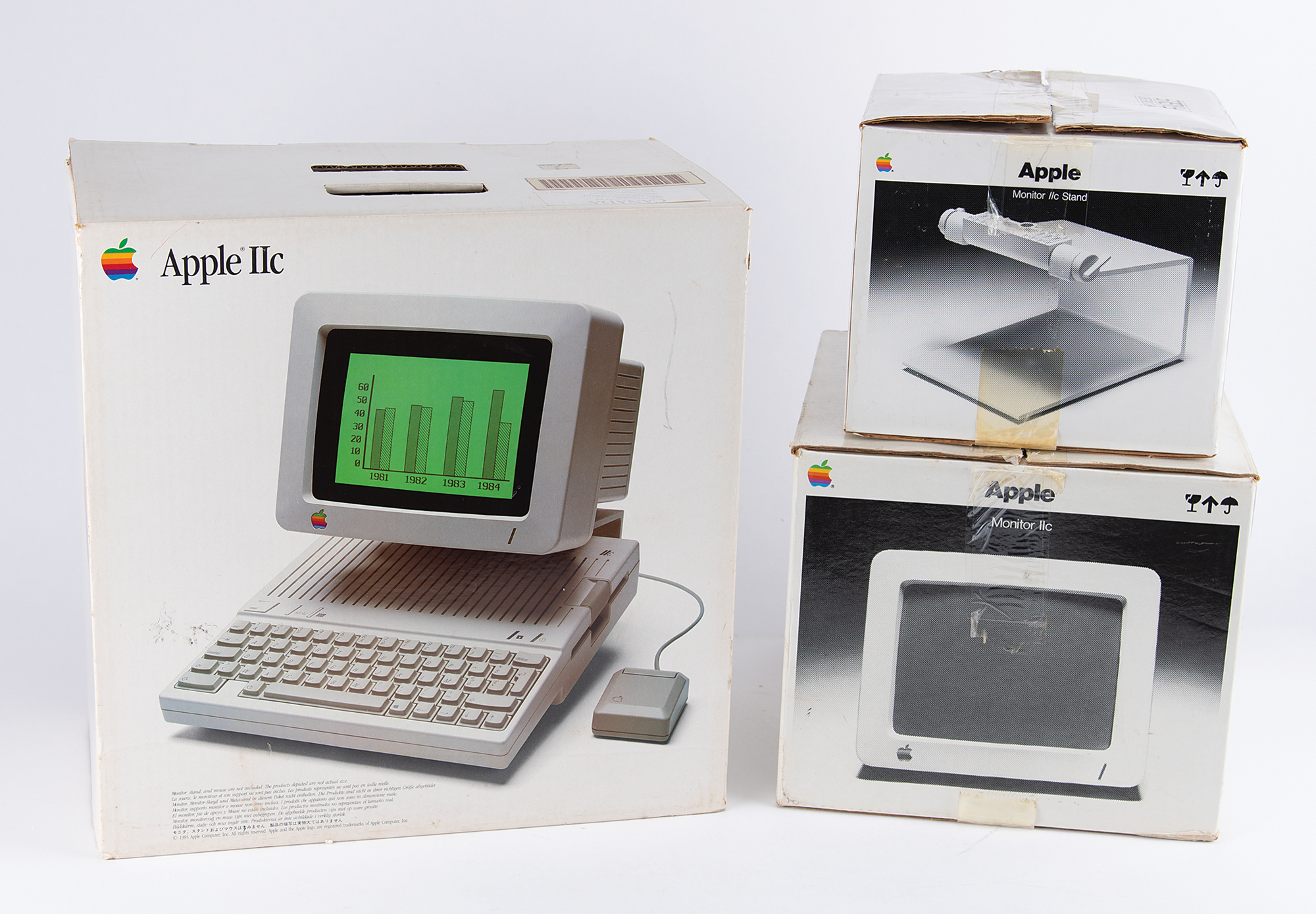 Desirable, functional Apple IIc personal computer, assembled in Ireland for the Canadian market (with Canadian keyboard), serial no. C63ALWXX, complete with its original box, as well as an Apple IIc Monitor and monitor stand. In the box with the Apple IIc computer are its original power supply, owner's manual, Apple 'rainbow' stickers, set-up guide, registration and warranty sheets, Applesoft BASIC manual and floppy disks. The Monitor IIc (Part No. A2M4090, Serial No. S105202A2M4090) is housed in its original box, accompanied by its user manual; and the original Monitor Stand (Part No. A2M4021) is also in its original box, with accompanying installation instructions. Tested and in working condition; in fine cosmetic condition. A scarce Apple IIc system—complete and functioning—in its desirable original packaging. The Apple IIc, released in April 1984, was Apple Computer’s first endeavor to produce a portable computer—it was essentially a complete Apple II squeezed into a smaller housing, and the 'c' stood for 'compact.'
