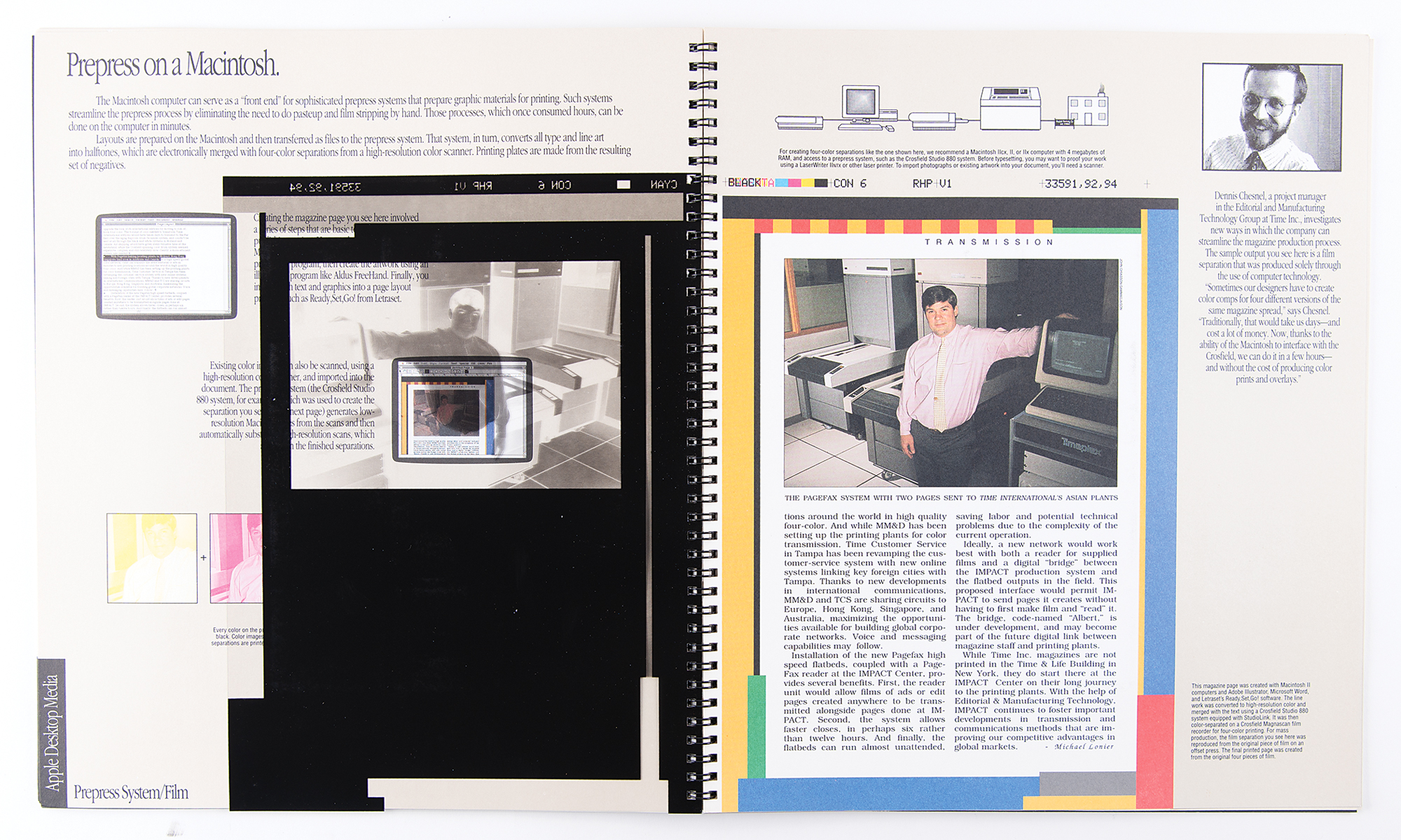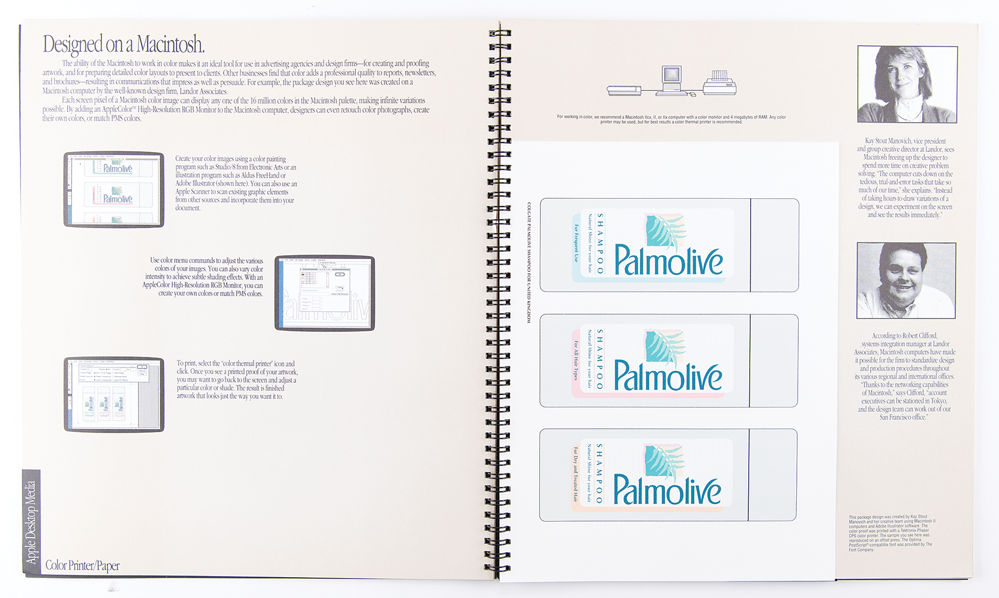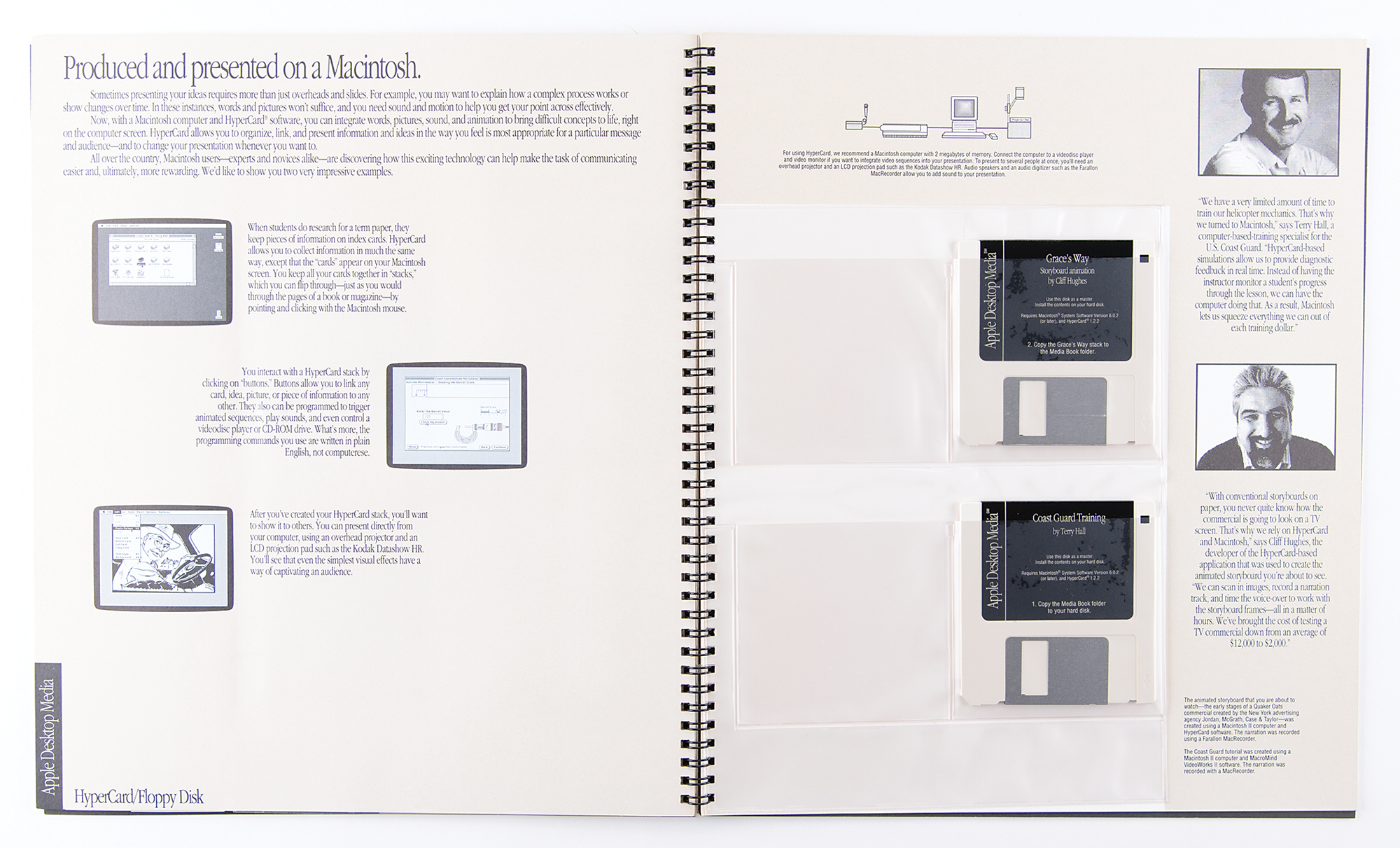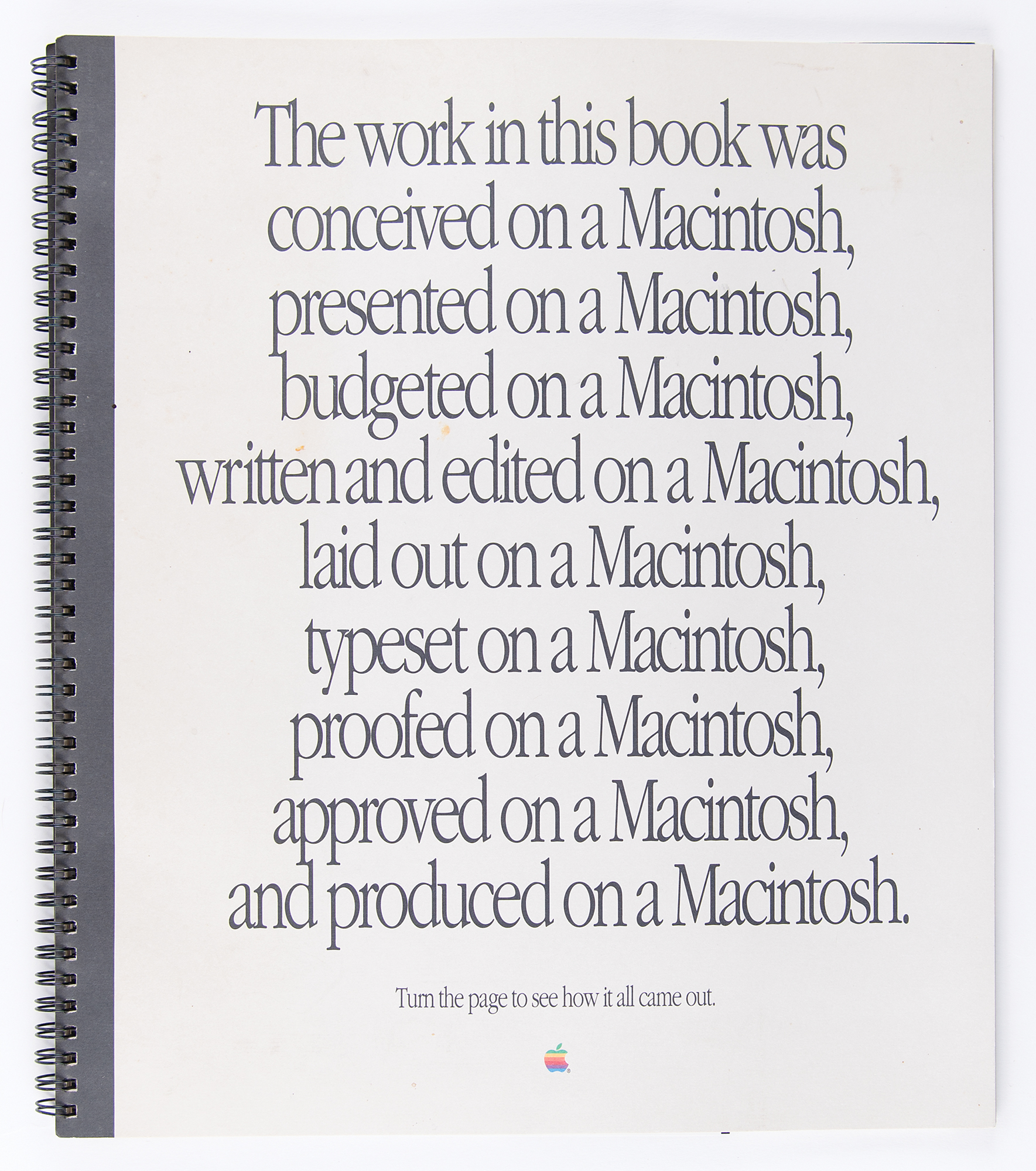Scarce spiral-bound Apple Macintosh desktop media book, 12 x 14, containing sample of desktop publishing materials created on the Macintosh. The cover reads, "The work in this book was conceived on a Macintosh, presented on a Macintosh, budgeted on a Macintosh, written and edited on a Macintosh, laid out on a Macintosh, typeset on a Macintosh, proofed on a Macintosh, approved on a Macintosh, and produced on a Macintosh," and the first page promises: "You are about to see, touch, and hear real-life examples of what people around the country are creating with Apple Macintosh computers. The printed documents, overhead transparencies, 35mm slides, and 'multimedia' demonstrations in this book are all effective means of communication that we call 'Apple Desktop Media.'" The 26-page book contains ten two-page spreads, each including a sample insert (maps, slides, transparencies, floppy disks, and printouts) that demonstrates the impressive capabilities of the Macintosh computer. In fine condition.