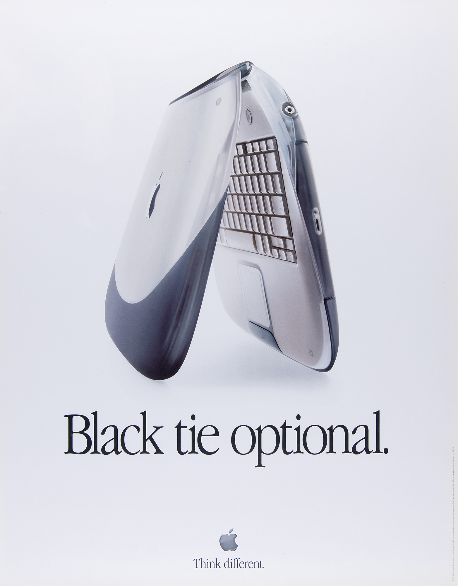 Uncommon original color 22 x 28 poster advertising the 'clamshell' iBook G3, featuring an image of the 'graphite' version of the notebook computer with text below: "Black tie optional." The bottom features Apple's logo in graphite, with the brand's famous slogan below: "Think different." A "2000" Apple Computer copyright notice is imprinted along the right edge. Rolled and in fine condition.