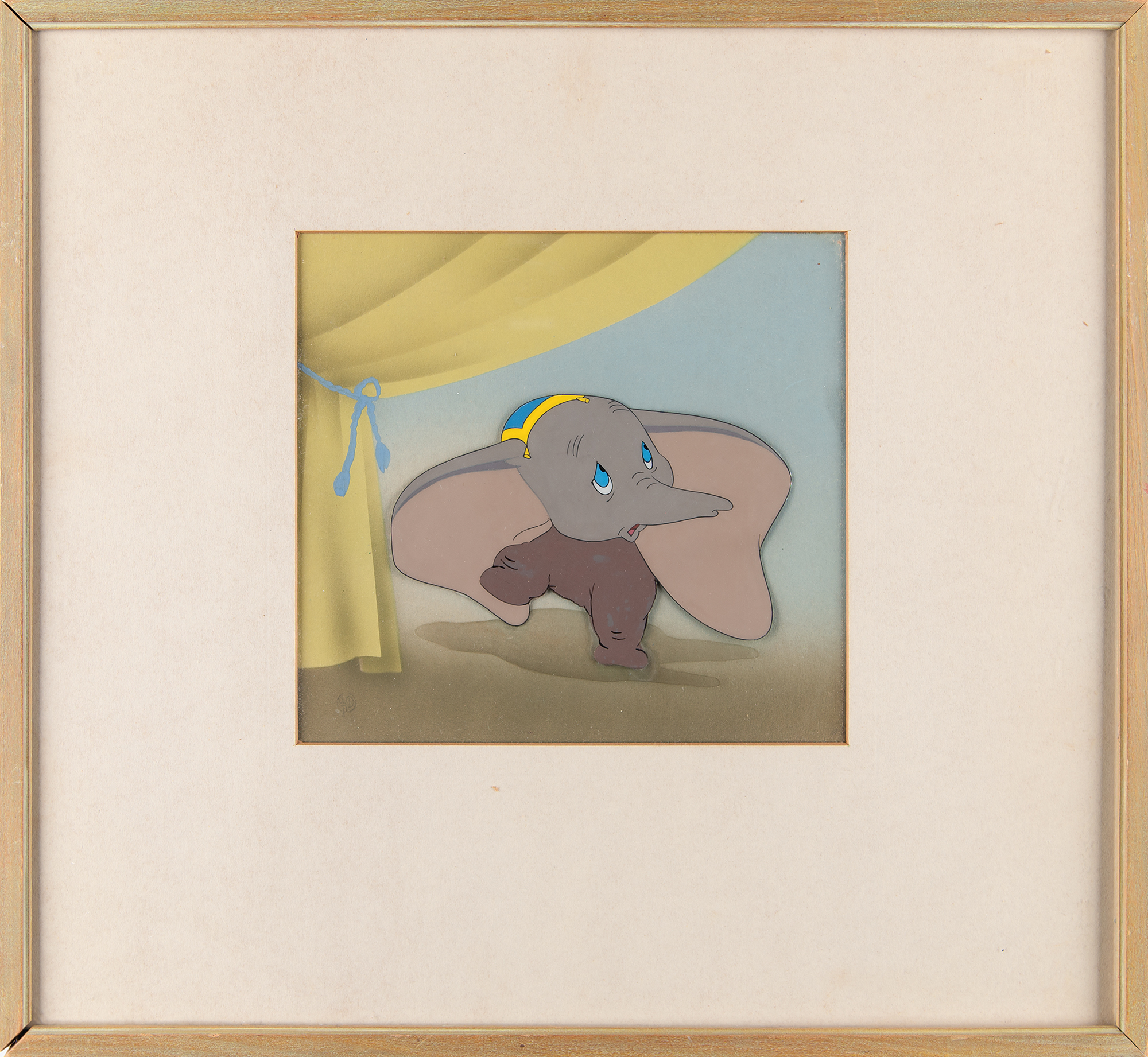 (Walt Disney Studios, 1941) Original production cel from Dumbo, showing the young elephant in a worrisome full-length pose, his head topped with his blue-and-yellow circus hat. The cel has been trimmed and applied to a hand-painted background as prepared by Courvoisier Galleries for sale. Image measures 5.5 x 3.5, with a mat opening of 7.5 x 6.75. Matted and framed to an overall size of 15.5 x 14. In fine condition, with slight discoloration to Dumbo’s lower half. Accompanied by a photocopy of the original Disney Courvoisier Galleries label.