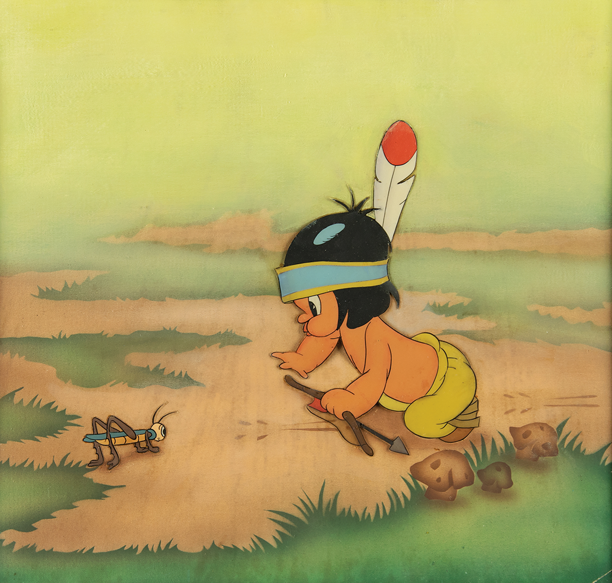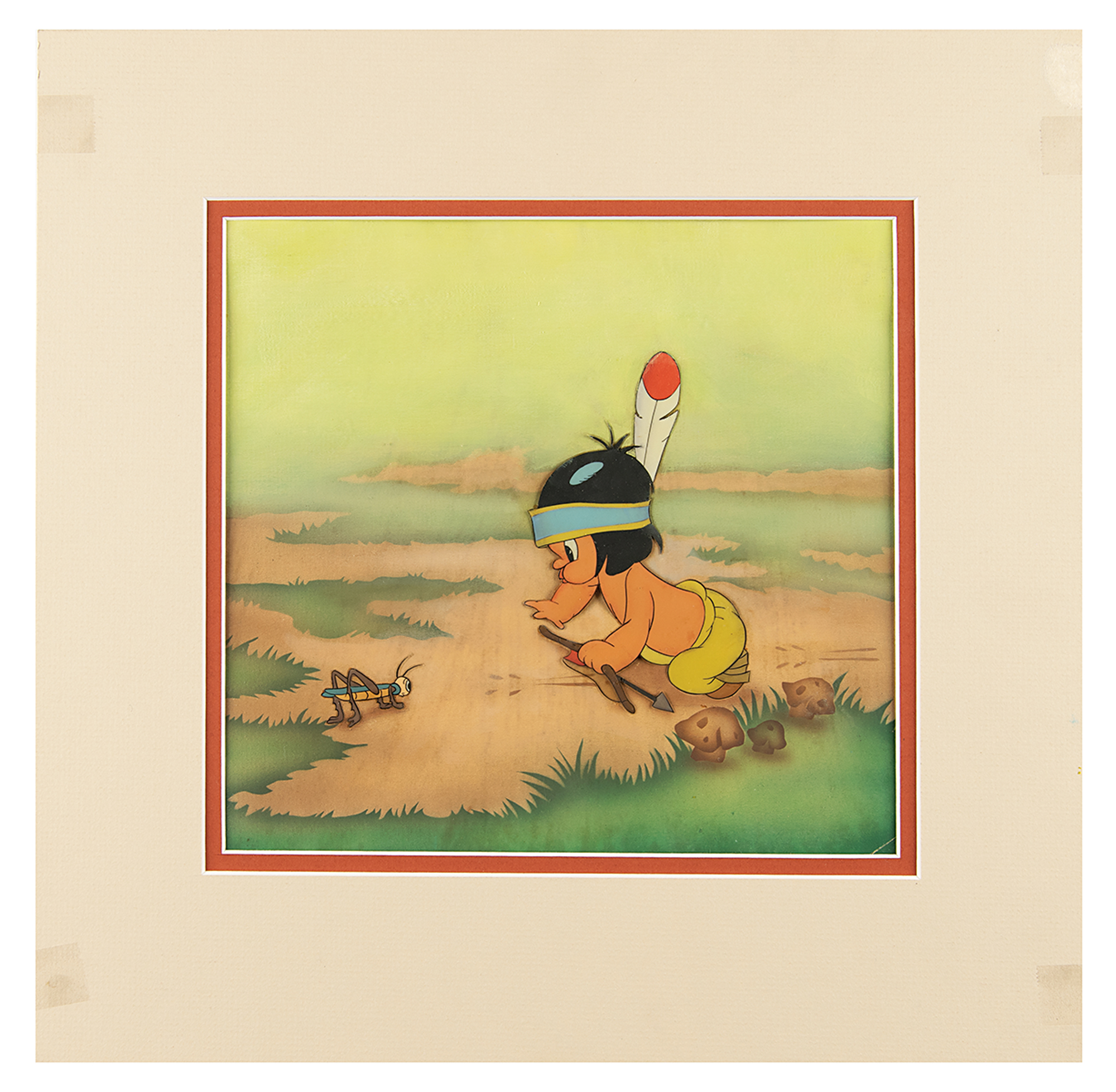 (Walt Disney Studios, 1937) Original production cels featuring Little Hiawatha and a grasshopper from the Silly Symphonies short Little Hiawatha, showing the cute little Native American holding his bow next to the elusive insect. The cels have been trimmed and applied to a hand-painted background as prepared by Courvoisier Galleries for sale. The Little Hiawatha image measures 3 x 4.75 and the grasshopper measures 1.25 x 1, with a mat opening of 8.5 x 8. Double-matted to an overall size of 13.5 x 13.25. In fine condition.