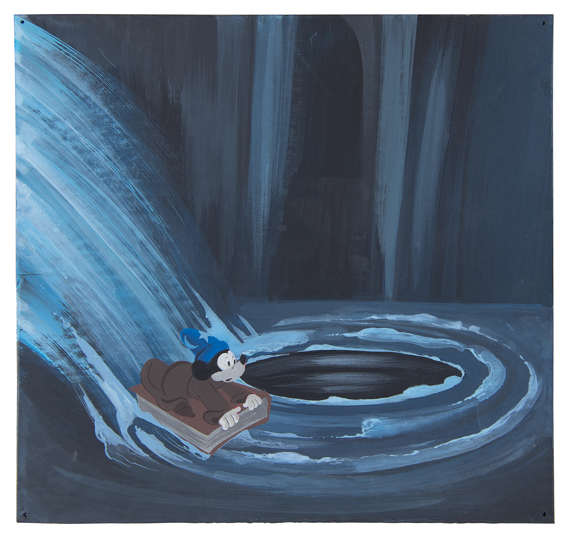 (Walt Disney Studios, 1940) Excellent original concept painting of Mickey Mouse from the 'Sorcerer's Apprentice' segment of Fantasia, showing the young wizard-to-be riding Sorcerer Yen Sid's spellbook next to a whirlpool. Accomplished in gouache on black 8.25 x 7.75 artist's board. In fine condition, with tack holes to corners.