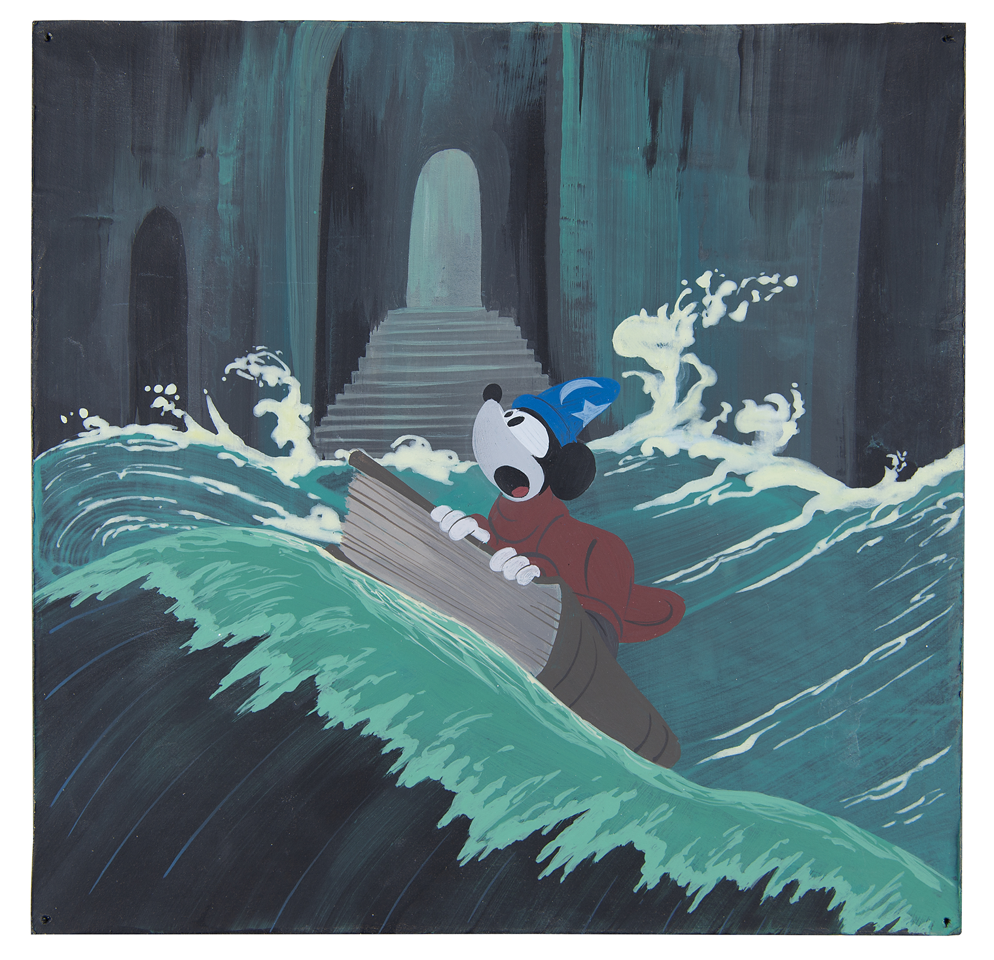 (Walt Disney Studios, 1940) Tremendous original concept painting of Mickey Mouse from the 'Sorcerer's Apprentice' segment of Fantasia, showing the young wizard-to-be using Yen Sid’s spellbook to ride the massive waves flooding the inner sanctum of the sorcerer’s tower. Accomplished in gouache on black 8.25 x 8.25 artist's board. In fine condition, with tack holes to corners. A magnificent concept piece that offers a harrowing and detailed perspective from this classic Fantasia sequence.