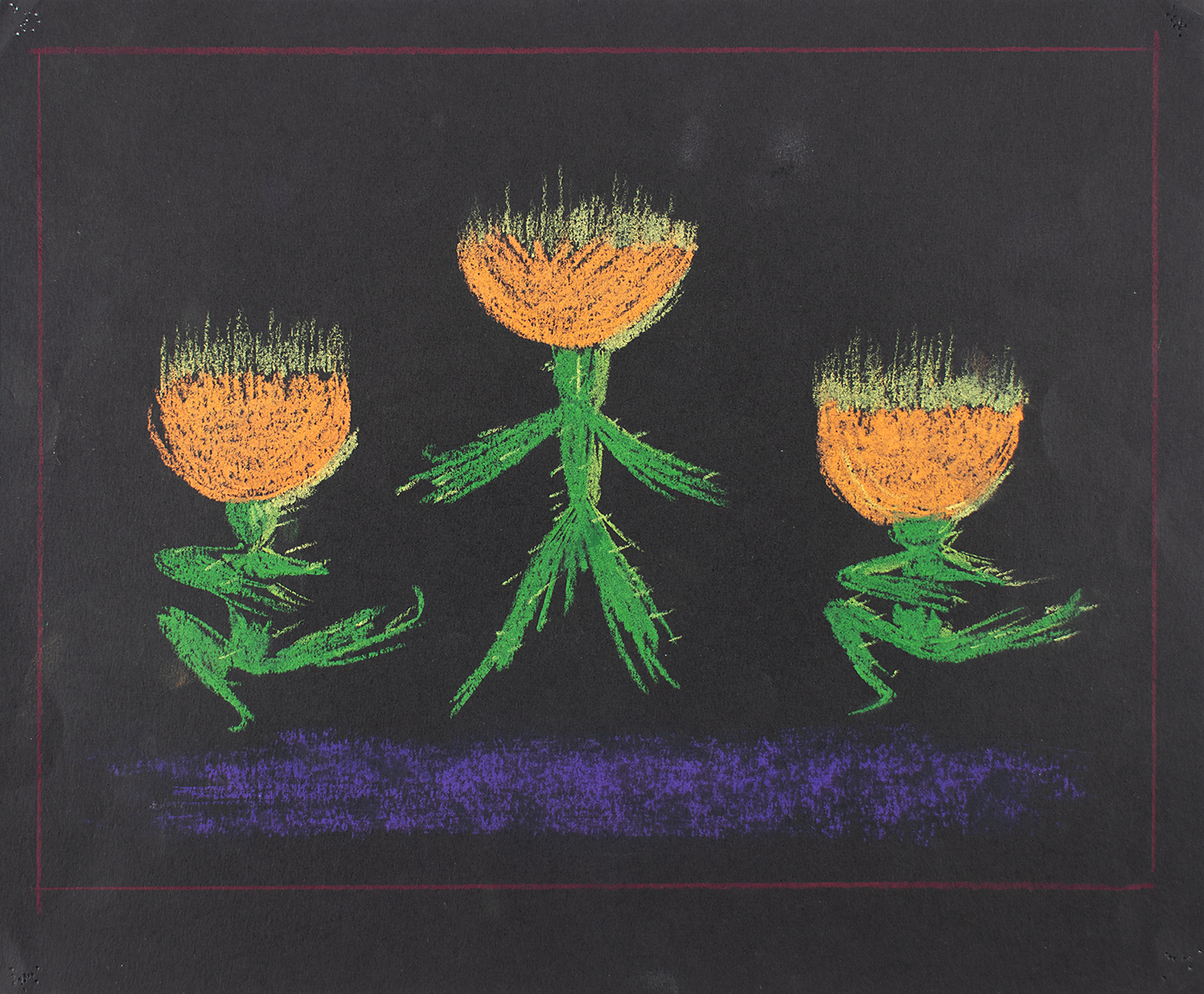 (Walt Disney Studios, 1940) Rare original concept storyboard drawing of Thistle Dancers from Fantasia, which depicts three of the orange-hatted thistles dancing during the 'Nutcracker Suite' segment. Accomplished in pastel on black 12 x 10 artist paper. Total image measures 10 x 6.5. In fine condition, with pin holes to corners.