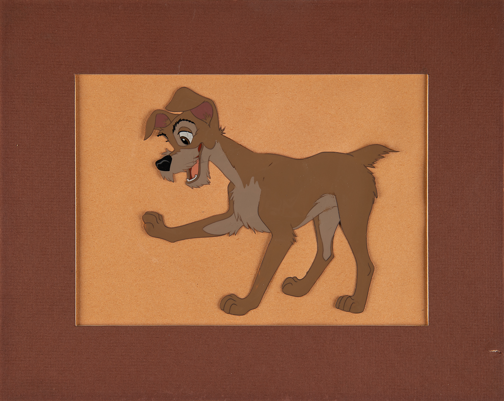 (Walt Disney Studios, 1955) Original production cel of Tramp from Lady and the Tramp, showing the lovable mutt in a playful full-figure pose. The image measures 5 x 4.5, with a mat opening of 7 x 5. Matted to an overall size of 10 x 8; the backing bears an affixed Walt Disney Productions label. This cel was originally sold at the Art Corner in Disneyland. In fine condition, with a small tear to the mat.