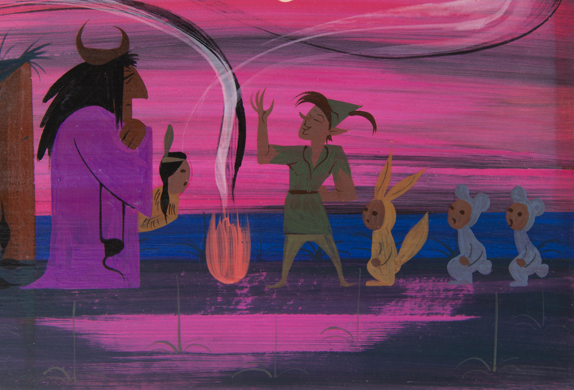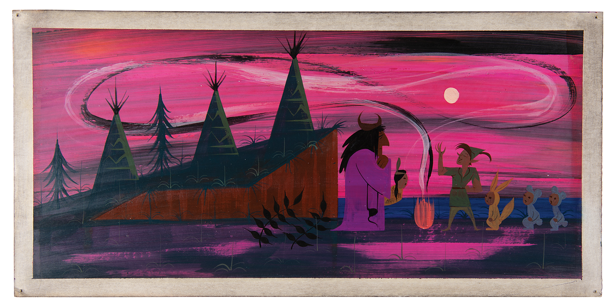 (Walt Disney Studios, 1953) Marvelous original panoramic concept painting by Mary Blair of Peter Pan, the Lost Boys, Tiger Lily, and her father, the Chief, around a fire in Neverland's Indian Village. Accomplished in tempera on 18.5 x 9 artist’s board, the painting shows the moment when Peter Pan safely returns Tiger Lily to her father after she was kidnapped by Captain Hook. Blair sets the scene below a vivid pink sky, balancing one side with a friendly celebratory fire and the other with a rising cliff lined with trees and Native tipis. In fine condition, with tack holes to corners.